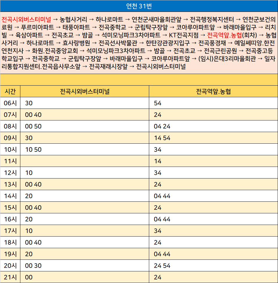 연천 31번: 전곡시외버스터미널 → 농협사거리 → 하나로마트 → 연천군새마을회관앞 → 전곡행정복지센터 → 연천군보건의료원 → 푸르미아파트 → 태풍아파트 → 전곡중학교 → 군립탁구장앞 → 코아루아파트앞 → 바래마을입구 → 리치빌 → 육삼아파트 → 전곡초교 → 밤골 → 석미모닝파크3차아파트 → KT전곡지점 → 전곡역앞.농협(회차) → 농협사거리 → 하나로마트 → 효사랑병원 → 전곡선사박물관 → 한탄강관광지입구 → 전곡풍경채 → 예일쎄띠앙.한전연천지사 → 화원.전곡중앙교회 → 석미모닝파크3차아파트 → 밤골 → 전곡초교 → 전곡근린공원 → 전곡중고등학교입구 → 전곡중학교 → 군립탁구장앞 → 바래마을입구 → 코아루아파트앞 → (임시)은대3리마을회관 → 일자리통합지원센터.전곡읍사무소앞 → 전곡재래시장앞 → 전곡시외버스터미널