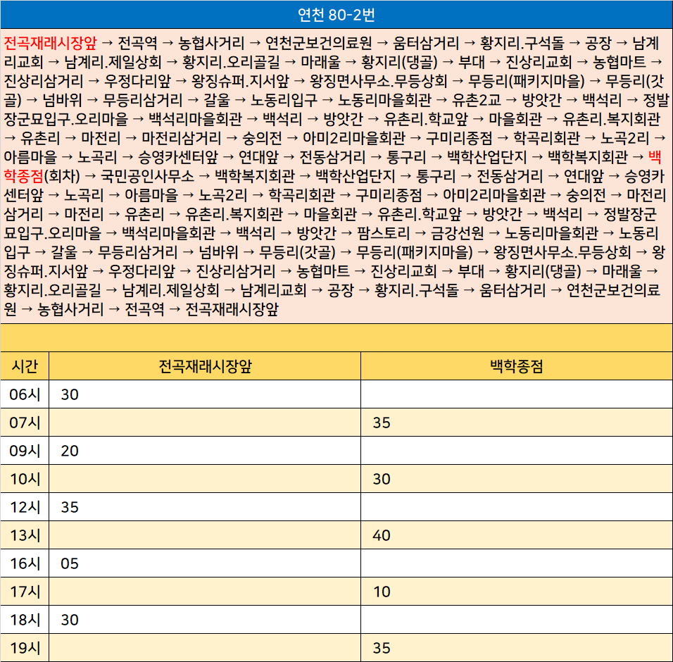 연천 80-2번: 전곡재래시장앞 → 전곡역 → 농협사거리 → 연천군보건의료원 → 움터삼거리 → 황지리.구석돌 → 공장 → 남계리교회 → 남계리.제일상회 → 황지리.오리골길 → 마래울 → 황지리(댕골) → 부대 → 진상리교회 → 농협마트 → 진상리삼거리 → 우정다리앞 → 왕징슈퍼.지서앞 → 왕징면사무소.무등상회 → 무등리(패키지마을) → 무등리(갓골) → 넘바위 → 무등리삼거리 → 갈울 → 노동리입구 → 노동리마을회관 → 유촌2교 → 방앗간 → 백석리 → 정발장군묘입구.오리마을 → 백석리마을회관 → 백석리 → 방앗간 → 유촌리.학교앞 → 마을회관 → 유촌리.복지회관 → 유촌리 → 마전리 → 마전리삼거리 → 숭의전 → 아미2리마을회관 → 구미리종점 → 학곡리회관 → 노곡2리 → 아름마을 → 노곡리 → 승영카센터앞 → 연대앞 → 전동삼거리 → 통구리 → 백학산업단지 → 백학복지회관 → 백학종점(회차) → 국민공인사무소 → 백학복지회관 → 백학산업단지 → 통구리 → 전동삼거리 → 연대앞 → 승영카센터앞 → 노곡리 → 아름마을 → 노곡2리 → 학곡리회관 → 구미리종점 → 아미2리마을회관 → 숭의전 → 마전리삼거리 → 마전리 → 유촌리 → 유촌리.복지회관 → 마을회관 → 유촌리.학교앞 → 방앗간 → 백석리 → 정발장군묘입구.오리마을 → 백석리마을회관 → 백석리 → 방앗간 → 팜스토리 → 금강선원 → 노동리마을회관 → 노동리입구 → 갈울 → 무등리삼거리 → 넘바위 → 무등리(갓골) → 무등리(패키지마을) → 왕징면사무소.무등상회 → 왕징슈퍼.지서앞 → 우정다리앞 → 진상리삼거리 → 농협마트 → 진상리교회 → 부대 → 황지리(댕골) → 마래울 → 황지리.오리골길 → 남계리.제일상회 → 남계리교회 → 공장 → 황지리.구석돌 → 움터삼거리 → 연천군보건의료원 → 농협사거리 → 전곡역 → 전곡재래시장앞