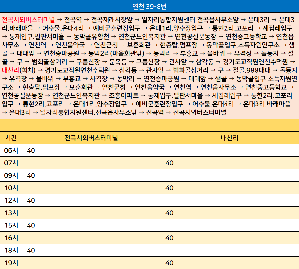 연천 39-8번: 전곡시외버스터미널 → 전곡역 → 전곡재래시장앞 → 일자리통합지원센터.전곡읍사무소앞 → 은대3리 → 은대3리.바래마을 → 어수물.은대4리 → 예비군훈련장입구 → 은대1리.양수장입구 → 통현2리.고포리 → 세집레입구 → 통재입구.팔판서마을 → 동막골유황천 → 연천군노인복지관 → 연천공설운동장 → 연천중고등학교 → 연천읍사무소 → 연천역 → 연천읍약국 → 연천군청 → 보훈회관 → 현충탑.펌프장 → 동막골입구.소득자원연구소 → 샘골 → 대대앞 → 연천승마공원 → 동막2리(마을회관앞) → 동막리 → 부흥교 → 물바위 → 유격장 → 돌둥지 → 절골 → 구 → 범화골삼거리 → 구름산장 → 문목동 → 구름산장 → 관사앞 → 삼각동 → 경기도교직원연천수덕원 → 내산리(회차) → 경기도교직원연천수덕원 → 삼각동 → 관사앞 → 범화골삼거리 → 구 → 절골.988대대 → 돌둥지 → 유격장 → 물바위 → 부흥교 → 사격장 → 동막리 → 연천승마공원 → 대대앞 → 샘골 → 동막골입구.소득자원연구소 → 현충탑.펌프장 → 보훈회관 → 연천군청 → 연천읍약국 → 연천역 → 연천읍사무소 → 연천중고등학교 → 연천공설운동장 → 연천군노인복지관 → 조흥아파트 → 통재입구.팔판서마을 → 세집레입구 → 통현2리.고포리입구 → 통현2리.고포리 → 은대1리.양수장입구 → 예비군훈련장입구 → 어수물.은대4리 → 은대3리.바래마을 → 은대3리 → 일자리통합지원센터.전곡읍사무소앞 → 전곡역 → 전곡시외버스터미널
