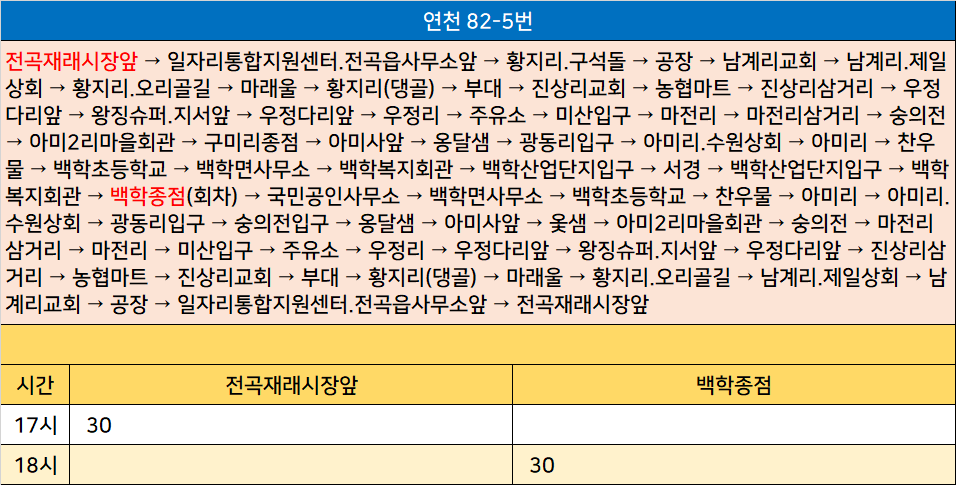 연천 82-5번: 전곡재래시장앞 → 일자리통합지원센터.전곡읍사무소앞 → 황지리.구석돌 → 공장 → 남계리교회 → 남계리.제일상회 → 황지리.오리골길 → 마래울 → 황지리(댕골) → 부대 → 진상리교회 → 농협마트 → 진상리삼거리 → 우정다리앞 → 왕징슈퍼.지서앞 → 우정다리앞 → 우정리 → 주유소 → 미산입구 → 마전리 → 마전리삼거리 → 숭의전 → 아미2리마을회관 → 구미리종점 → 아미사앞 → 옹달샘 → 광동리입구 → 아미리.수원상회 → 아미리 → 찬우물 → 백학초등학교 → 백학면사무소 → 백학복지회관 → 백학산업단지입구 → 서경 → 백학산업단지입구 → 백학복지회관 → 백학종점(회차) → 국민공인사무소 → 백학면사무소 → 백학초등학교 → 찬우물 → 아미리 → 아미리.수원상회 → 광동리입구 → 숭의전입구 → 옹달샘 → 아미사앞 → 옻샘 → 아미2리마을회관 → 숭의전 → 마전리삼거리 → 마전리 → 미산입구 → 주유소 → 우정리 → 우정다리앞 → 왕징슈퍼.지서앞 → 우정다리앞 → 진상리삼거리 → 농협마트 → 진상리교회 → 부대 → 황지리(댕골) → 마래울 → 황지리.오리골길 → 남계리.제일상회 → 남계리교회 → 공장 → 일자리통합지원센터.전곡읍사무소앞 → 전곡재래시장앞