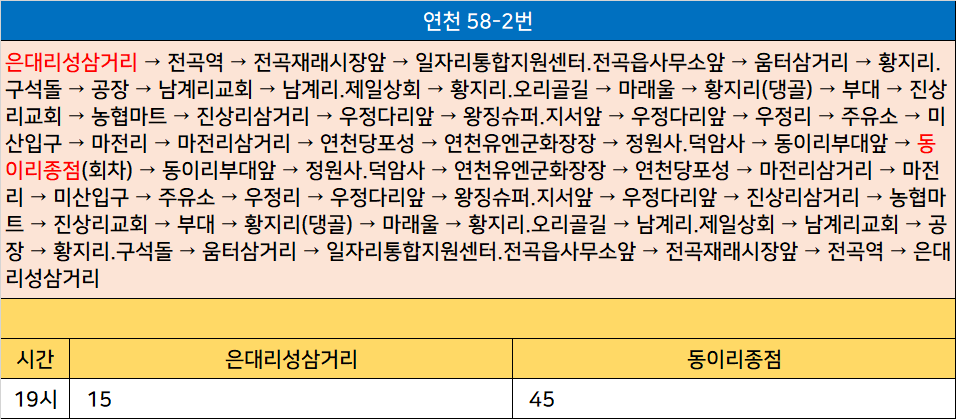 연천 58-2번: 은대리성삼거리 → 전곡역 → 전곡재래시장앞 → 일자리통합지원센터.전곡읍사무소앞 → 움터삼거리 → 황지리.구석돌 → 공장 → 남계리교회 → 남계리.제일상회 → 황지리.오리골길 → 마래울 → 황지리(댕골) → 부대 → 진상리교회 → 농협마트 → 진상리삼거리 → 우정다리앞 → 왕징슈퍼.지서앞 → 우정다리앞 → 우정리 → 주유소 → 미산입구 → 마전리 → 마전리삼거리 → 연천당포성 → 연천유엔군화장장 → 정원사.덕암사 → 동이리부대앞 → 동이리종점(회차) → 동이리부대앞 → 정원사.덕암사 → 연천유엔군화장장 → 연천당포성 → 마전리삼거리 → 마전리 → 미산입구 → 주유소 → 우정리 → 우정다리앞 → 왕징슈퍼.지서앞 → 우정다리앞 → 진상리삼거리 → 농협마트 → 진상리교회 → 부대 → 황지리(댕골) → 마래울 → 황지리.오리골길 → 남계리.제일상회 → 남계리교회 → 공장 → 황지리.구석돌 → 움터삼거리 → 일자리통합지원센터.전곡읍사무소앞 → 전곡재래시장앞 → 전곡역 → 은대리성삼거리
