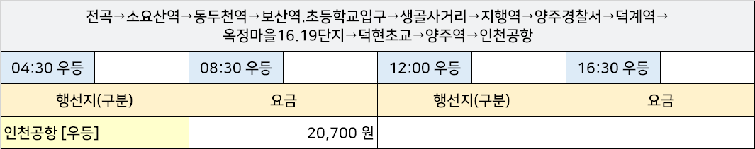 연천공영시외고속버스터미널 연천공영정류장 연천공영정류소 → "전곡→소요산역→동두천역→보산역.초등학교입구→생골사거리→지행역→양주경찰서→덕계역→옥정마을16.19단지→덕현초교→양주역→인천공항".