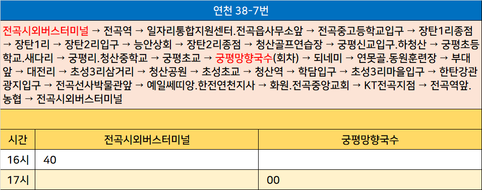 연천 38-7번: 전곡시외버스터미널 → 전곡역 → 일자리통합지원센터.전곡읍사무소앞 → 전곡중고등학교입구 → 장탄1리종점 → 장탄1리 → 장탄2리입구 → 능안상회 → 장탄2리종점 → 청산골프연습장 → 궁평신교입구.하청산 → 궁평초등학교.새다리 → 궁평리.청산중학교 → 궁평초교 → 궁평망향국수(회차) → 되네미 → 연못골.동원훈련장 → 부대앞 → 대전리 → 초성3리삼거리 → 청산공원 → 초성초교 → 청산역 → 학담입구 → 초성3리마을입구 → 한탄강관광지입구 → 전곡선사박물관앞 → 예일쎄띠앙.한전연천지사 → 화원.전곡중앙교회 → KT전곡지점 → 전곡역앞.농협 → 전곡시외버스터미널