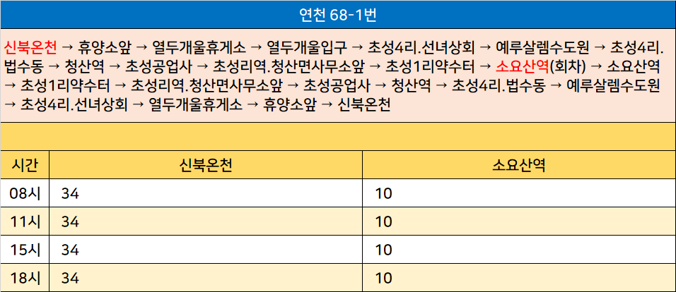 연천 68-1번: 신북온천 → 휴양소앞 → 열두개울휴게소 → 열두개울입구 → 초성4리.선녀상회 → 예루살렘수도원 → 초성4리.법수동 → 청산역 → 초성공업사 → 초성리역.청산면사무소앞 → 초성1리약수터 → 소요산역(회차) → 소요산역 → 초성1리약수터 → 초성리역.청산면사무소앞 → 초성공업사 → 청산역 → 초성4리.법수동 → 예루살렘수도원 → 초성4리.선녀상회 → 열두개울휴게소 → 휴양소앞 → 신북온천