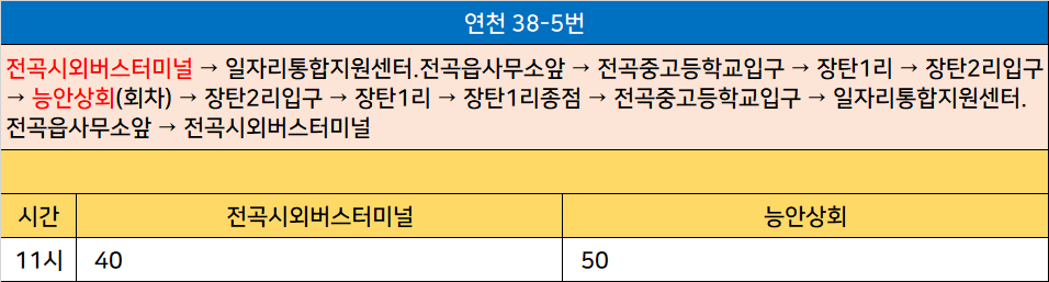 연천 38-5번: 전곡시외버스터미널 → 일자리통합지원센터.전곡읍사무소앞 → 전곡중고등학교입구 → 장탄1리 → 장탄2리입구 → 능안상회(회차) → 장탄2리입구 → 장탄1리 → 장탄1리종점 → 전곡중고등학교입구 → 일자리통합지원센터.전곡읍사무소앞 → 전곡시외버스터미널