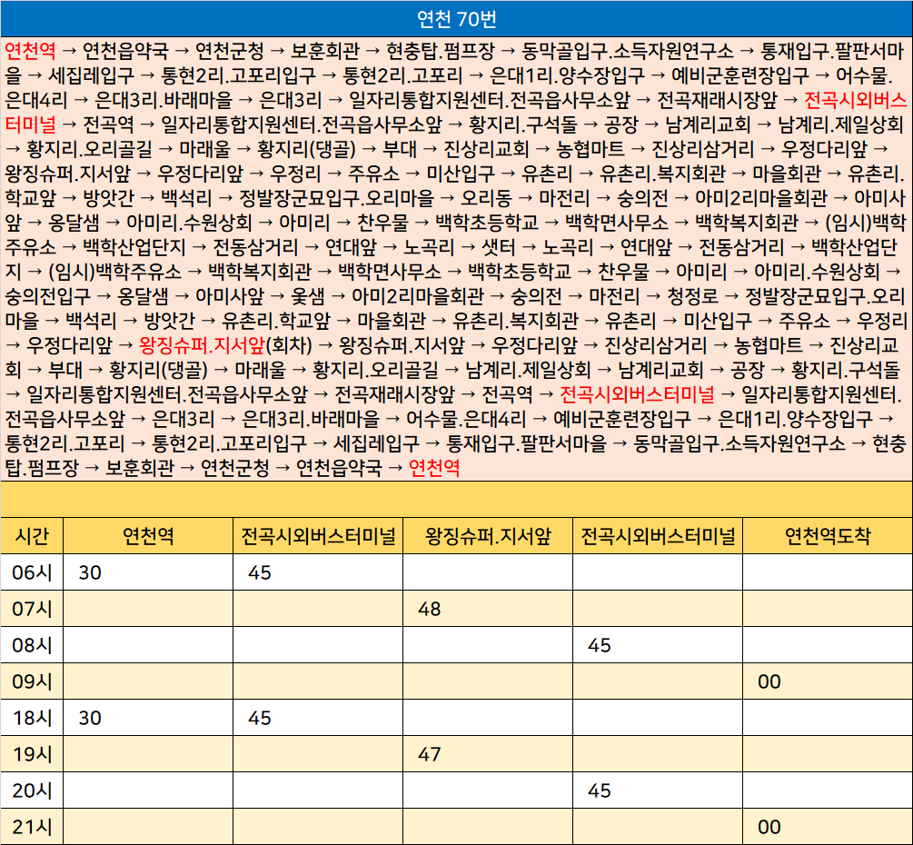 연천 70번: 연천역 → 연천읍약국 → 연천군청 → 보훈회관 → 현충탑.펌프장 → 동막골입구.소득자원연구소 → 통재입구.팔판서마을 → 세집레입구 → 통현2리.고포리입구 → 통현2리.고포리 → 은대1리.양수장입구 → 예비군훈련장입구 → 어수물.은대4리 → 은대3리.바래마을 → 은대3리 → 일자리통합지원센터.전곡읍사무소앞 → 전곡재래시장앞 → 전곡시외버스터미널 → 전곡역 → 일자리통합지원센터.전곡읍사무소앞 → 황지리.구석돌 → 공장 → 남계리교회 → 남계리.제일상회 → 황지리.오리골길 → 마래울 → 황지리(댕골) → 부대 → 진상리교회 → 농협마트 → 진상리삼거리 → 우정다리앞 → 왕징슈퍼.지서앞 → 우정다리앞 → 우정리 → 주유소 → 미산입구 → 유촌리 → 유촌리.복지회관 → 마을회관 → 유촌리.학교앞 → 방앗간 → 백석리 → 정발장군묘입구.오리마을 → 오리동 → 마전리 → 숭의전 → 아미2리마을회관 → 아미사앞 → 옹달샘 → 아미리.수원상회 → 아미리 → 찬우물 → 백학초등학교 → 백학면사무소 → 백학복지회관 → (임시)백학주유소 → 백학산업단지 → 전동삼거리 → 연대앞 → 노곡리 → 샛터 → 노곡리 → 연대앞 → 전동삼거리 → 백학산업단지 → (임시)백학주유소 → 백학복지회관 → 백학면사무소 → 백학초등학교 → 찬우물 → 아미리 → 아미리.수원상회 → 숭의전입구 → 옹달샘 → 아미사앞 → 옻샘 → 아미2리마을회관 → 숭의전 → 마전리 → 청정로 → 정발장군묘입구.오리마을 → 백석리 → 방앗간 → 유촌리.학교앞 → 마을회관 → 유촌리.복지회관 → 유촌리 → 미산입구 → 주유소 → 우정리 → 우정다리앞 → 왕징슈퍼.지서앞(회차) → 왕징슈퍼.지서앞 → 우정다리앞 → 진상리삼거리 → 농협마트 → 진상리교회 → 부대 → 황지리(댕골) → 마래울 → 황지리.오리골길 → 남계리.제일상회 → 남계리교회 → 공장 → 황지리.구석돌 → 일자리통합지원센터.전곡읍사무소앞 → 전곡재래시장앞 → 전곡역 → 전곡시외버스터미널 → 일자리통합지원센터.전곡읍사무소앞 → 은대3리 → 은대3리.바래마을 → 어수물.은대4리 → 예비군훈련장입구 → 은대1리.양수장입구 → 통현2리.고포리 → 통현2리.고포리입구 → 세집레입구 → 통재입구.팔판서마을 → 동막골입구.소득자원연구소 → 현충탑.펌프장 → 보훈회관 → 연천군청 → 연천읍약국 → 연천역