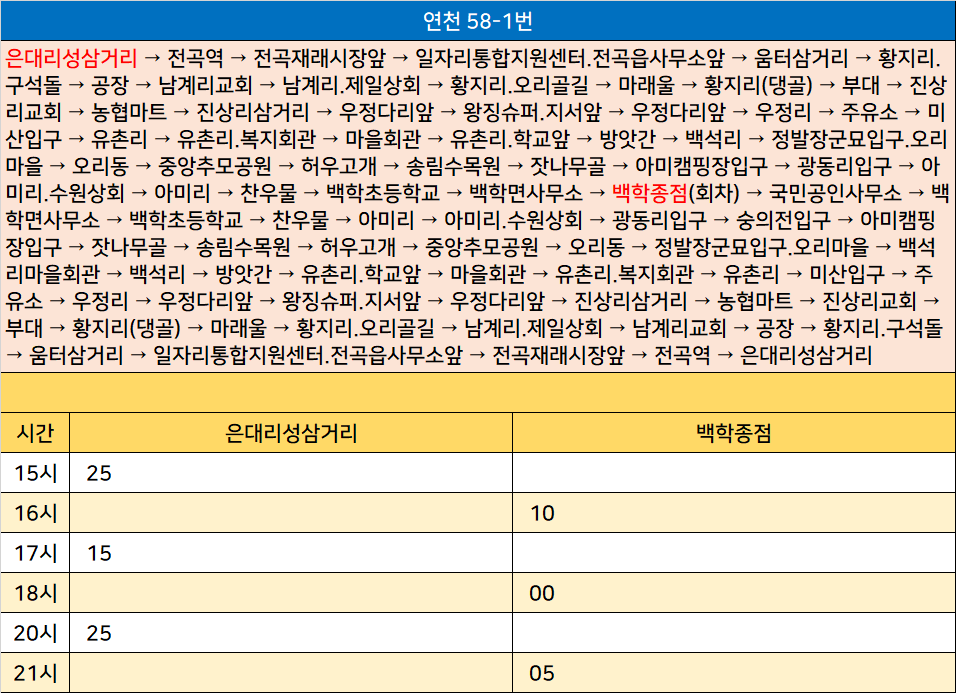 연천 58-1번: 은대리성삼거리 → 전곡역 → 전곡재래시장앞 → 일자리통합지원센터.전곡읍사무소앞 → 움터삼거리 → 황지리.구석돌 → 공장 → 남계리교회 → 남계리.제일상회 → 황지리.오리골길 → 마래울 → 황지리(댕골) → 부대 → 진상리교회 → 농협마트 → 진상리삼거리 → 우정다리앞 → 왕징슈퍼.지서앞 → 우정다리앞 → 우정리 → 주유소 → 미산입구 → 유촌리 → 유촌리.복지회관 → 마을회관 → 유촌리.학교앞 → 방앗간 → 백석리 → 정발장군묘입구.오리마을 → 오리동 → 중앙추모공원 → 허우고개 → 송림수목원 → 잣나무골 → 아미캠핑장입구 → 광동리입구 → 아미리.수원상회 → 아미리 → 찬우물 → 백학초등학교 → 백학면사무소 → 백학종점(회차) → 국민공인사무소 → 백학면사무소 → 백학초등학교 → 찬우물 → 아미리 → 아미리.수원상회 → 광동리입구 → 숭의전입구 → 아미캠핑장입구 → 잣나무골 → 송림수목원 → 허우고개 → 중앙추모공원 → 오리동 → 정발장군묘입구.오리마을 → 백석리마을회관 → 백석리 → 방앗간 → 유촌리.학교앞 → 마을회관 → 유촌리.복지회관 → 유촌리 → 미산입구 → 주유소 → 우정리 → 우정다리앞 → 왕징슈퍼.지서앞 → 우정다리앞 → 진상리삼거리 → 농협마트 → 진상리교회 → 부대 → 황지리(댕골) → 마래울 → 황지리.오리골길 → 남계리.제일상회 → 남계리교회 → 공장 → 황지리.구석돌 → 움터삼거리 → 일자리통합지원센터.전곡읍사무소앞 → 전곡재래시장앞 → 전곡역 → 은대리성삼거리