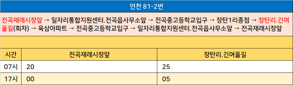 연천 81-2번: 전곡재래시장앞 → 일자리통합지원센터.전곡읍사무소앞 → 전곡중고등학교입구 → 장탄1리종점 → 장탄리.긴여울길(회차) → 육삼아파트 → 전곡중고등학교입구 → 일자리통합지원센터.전곡읍사무소앞 → 전곡재래시장앞