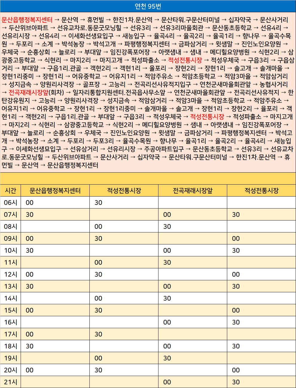 연천 95번: 문산읍행정복지센터 → 문산역 → 휴먼빌 → 한진1차.문산역 → 문산타워.구문산터미널 → 십자약국 → 문산사거리 → 두산위브아파트 → 선유교차로.동문굿모닝힐 → 선유3리 → 선유3리마을회관 → 문산동초등학교 → 선유4리 → 선유리시장 → 선유4리 → 이세화선생묘입구 → 새능입구 → 율곡4리 → 율곡2리 → 율곡1리 → 향나무 → 율곡수목원 → 두포리 → 소계 → 박석농장 → 박석고개 → 파평행정복지센터 → 금파삼거리 → 윗샘말 → 진인노인요양원 → 우체국 → 순흥상회 → 늘로리 → 부대앞 → 임진강폭포어장 → 아랫샘내 → 샘내 → 메디힐요양병원 → 식현2리 → 삼광중고등학교 → 식현리 → 마지2리 → 마지고개 → 적성파출소 → 적성전통시장 → 적성우체국 → 구읍3리 → 구읍삼거리 → 부대앞 → 구읍1리.관골 → 객현2리 → 객현1리 → 율포리 → 장현2리 → 장현1리 → 솔고개 → 솔개마을 → 장현1리중미 → 장현1리 → 어유중학교 → 어유지1리 → 적암주유소 → 적암초등학교 → 적암3마을 → 적암삼거리 → 성지금속 → 양원리사격장 → 골프장 → 고능리 → 전곡리선사유적지입구 → 연천군새마을회관앞 → 농협사거리 → 전곡재래시장앞(회차) → 일자리통합지원센터.전곡읍사무소앞 → 연천군새마을회관앞 → 전곡리선사유적지 → 한탄강유원지 → 고능리 → 양원리사격장 → 성지금속 → 적암삼거리 → 적암3마을 → 적암초등학교 → 적암주유소 → 어유지1리 → 어유중학교 → 장현1리 → 장현1리중미 → 솔개마을 → 솔고개 → 장현1리 → 장현2리 → 율포리 → 객현1리 → 객현2리 → 구읍1리.관골 → 부대앞 → 구읍3리 → 적성우체국 → 적성전통시장 → 적성파출소 → 마지고개 → 마지2리 → 식현리 → 삼광중고등학교 → 식현2리 → 메디힐요양병원 → 샘내 → 아랫샘내 → 임진강폭포어장 → 부대앞 → 늘로리 → 순흥상회 → 우체국 → 진인노인요양원 → 윗샘말 → 금파삼거리 → 파평행정복지센터 → 박석고개 → 박석농장 → 소계 → 두포리 → 두포3리 → 율곡수목원 → 향나무 → 율곡1리 → 율곡2리 → 율곡4리 → 새능입구 → 이세화선생묘입구 → 선유삼거리 → 선유리시장 → 주공아파트입구 → 문산동초등학교 → 선유3리 → 선유교차로.동문굿모닝힐 → 두산위브아파트 → 문산사거리 → 십자약국 → 문산타워.구문산터미널 → 한진1차.문산역 → 휴먼빌 → 문산역 → 문산읍행정복지센터