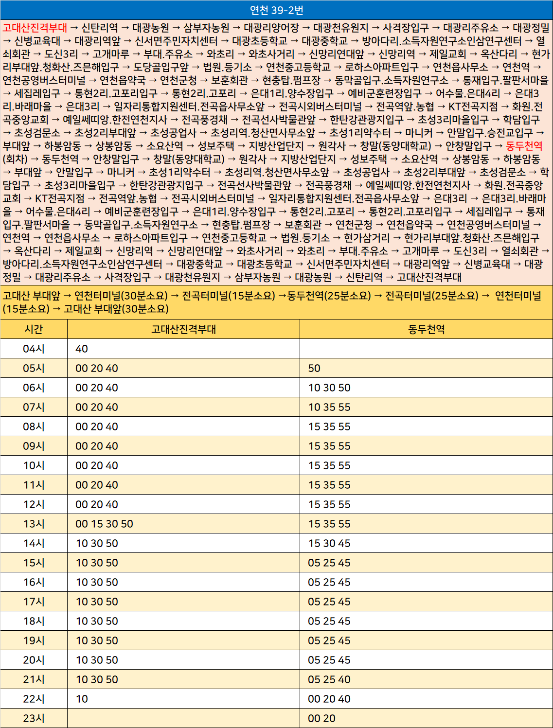 연천 39-2번: 고대산진격부대 → 신탄리역 → 대광농원 → 삼부자농원 → 대광리양어장 → 대광천유원지 → 사격장입구 → 대광리주유소 → 대광정밀 → 신병교육대 → 대광리역앞 → 신서면주민자치센터 → 대광초등학교 → 대광중학교 → 방아다리.소득자원연구소인삼연구센터 → 열쇠회관 → 도신3리 → 고개마루 → 부대.주유소 → 와초리 → 와초사거리 → 신망리연대앞 → 신망리역 → 제일교회 → 옥산다리 → 현가리부대앞.청화산.즈믄해입구 → 도당골입구앞 → 법원.등기소 → 연천중고등학교 → 로하스아파트입구 → 연천읍사무소 → 연천역 → 연천공영버스터미널 → 연천읍약국 → 연천군청 → 보훈회관 → 현충탑.펌프장 → 동막골입구.소득자원연구소 → 통재입구.팔판서마을 → 세집레입구 → 통현2리.고포리입구 → 통현2리.고포리 → 은대1리.양수장입구 → 예비군훈련장입구 → 어수물.은대4리 → 은대3리.바래마을 → 은대3리 → 일자리통합지원센터.전곡읍사무소앞 → 전곡시외버스터미널 → 전곡역앞.농협 → KT전곡지점 → 화원.전곡중앙교회 → 예일쎄띠앙.한전연천지사 → 전곡풍경채 → 전곡선사박물관앞 → 한탄강관광지입구 → 초성3리마을입구 → 학담입구 → 초성검문소 → 초성2리부대앞 → 초성공업사 → 초성리역.청산면사무소앞 → 초성1리약수터 → 마니커 → 안말입구.승전교입구 → 부대앞 → 하봉암동 → 상봉암동 → 소요산역 → 성보주택 → 지방산업단지 → 원각사 → 창말(동양대학교) → 안창말입구 → 동두천역(회차) → 동두천역 → 안창말입구 → 창말(동양대학교) → 원각사 → 지방산업단지 → 성보주택 → 소요산역 → 상봉암동 → 하봉암동 → 부대앞 → 안말입구 → 마니커 → 초성1리약수터 → 초성리역.청산면사무소앞 → 초성공업사 → 초성2리부대앞 → 초성검문소 → 학담입구 → 초성3리마을입구 → 한탄강관광지입구 → 전곡선사박물관앞 → 전곡풍경채 → 예일쎄띠앙.한전연천지사 → 화원.전곡중앙교회 → KT전곡지점 → 전곡역앞.농협 → 전곡시외버스터미널 → 일자리통합지원센터.전곡읍사무소앞 → 은대3리 → 은대3리.바래마을 → 어수물.은대4리 → 예비군훈련장입구 → 은대1리.양수장입구 → 통현2리.고포리 → 통현2리.고포리입구 → 세집레입구 → 통재입구.팔판서마을 → 동막골입구.소득자원연구소 → 현충탑.펌프장 → 보훈회관 → 연천군청 → 연천읍약국 → 연천공영버스터미널 → 연천역 → 연천읍사무소 → 로하스아파트입구 → 연천중고등학교 → 법원.등기소 → 현가삼거리 → 현가리부대앞.청화산.즈믄해입구 → 옥산다리 → 제일교회 → 신망리역 → 신망리연대앞 → 와초사거리 → 와초리 → 부대.주유소 → 고개마루 → 도신3리 → 열쇠회관 → 방아다리.소득자원연구소인삼연구센터 → 대광중학교 → 대광초등학교 → 신서면주민자치센터 → 대광리역앞 → 신병교육대 → 대광정밀 → 대광리주유소 → 사격장입구 → 대광천유원지 → 삼부자농원 → 대광농원 → 신탄리역 → 고대산진격부대