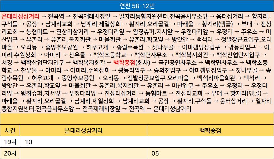 연천 58-12번: 은대리성삼거리 → 전곡역 → 전곡재래시장앞 → 일자리통합지원센터.전곡읍사무소앞 → 움터삼거리 → 황지리.구석돌 → 공장 → 남계리교회 → 남계리.제일상회 → 황지리.오리골길 → 마래울 → 황지리(댕골) → 부대 → 진상리교회 → 농협마트 → 진상리삼거리 → 우정다리앞 → 왕징슈퍼.지서앞 → 우정다리앞 → 우정리 → 주유소 → 미산입구 → 유촌리 → 유촌리.복지회관 → 마을회관 → 유촌리.학교앞 → 방앗간 → 백석리 → 정발장군묘입구.오리마을 → 오리동 → 중앙추모공원 → 허우고개 → 송림수목원 → 잣나무골 → 아미캠핑장입구 → 광동리입구 → 아미리.수원상회 → 아미리 → 찬우물 → 백학초등학교 → 백학면사무소 → 백학복지회관 → 백학산업단지입구 → 서경 → 백학산업단지입구 → 백학복지회관 → 백학종점(회차) → 국민공인사무소 → 백학면사무소 → 백학초등학교 → 찬우물 → 아미리 → 아미리.수원상회 → 광동리입구 → 숭의전입구 → 아미캠핑장입구 → 잣나무골 → 송림수목원 → 허우고개 → 중앙추모공원 → 오리동 → 정발장군묘입구.오리마을 → 백석리마을회관 → 백석리 → 방앗간 → 유촌리.학교앞 → 마을회관 → 유촌리.복지회관 → 유촌리 → 미산입구 → 주유소 → 우정리 → 우정다리앞 → 왕징슈퍼.지서앞 → 우정다리앞 → 진상리삼거리 → 농협마트 → 진상리교회 → 부대 → 황지리(댕골) → 마래울 → 황지리.오리골길 → 남계리.제일상회 → 남계리교회 → 공장 → 황지리.구석돌 → 움터삼거리 → 일자리통합지원센터.전곡읍사무소앞 → 전곡재래시장앞 → 전곡역 → 은대리성삼거리
