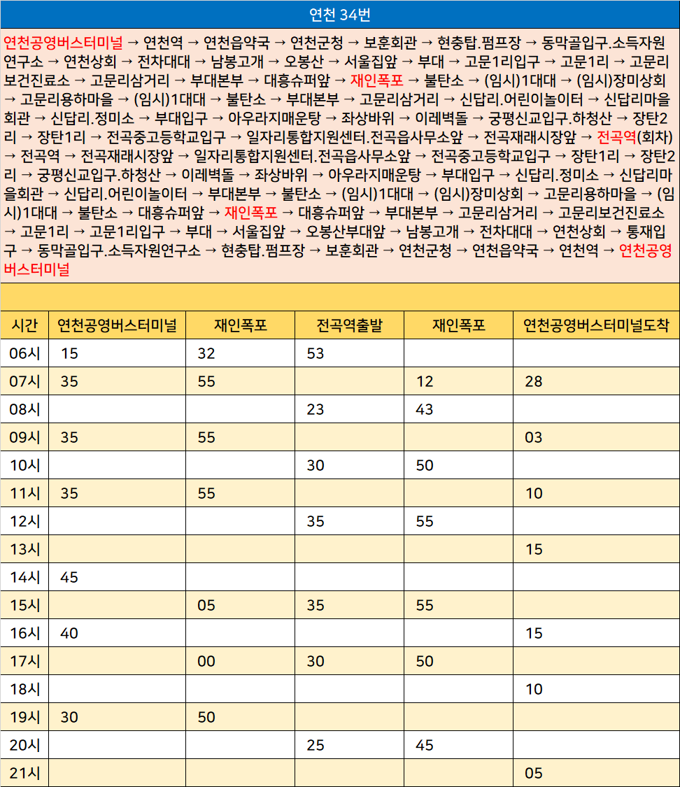 연천 34번: 연천공영버스터미널 → 연천역 → 연천읍약국 → 연천군청 → 보훈회관 → 현충탑.펌프장 → 동막골입구.소득자원연구소 → 연천상회 → 전차대대 → 남봉고개 → 오봉산 → 서울집앞 → 부대 → 고문1리입구 → 고문1리 → 고문리보건진료소 → 고문리삼거리 → 부대본부 → 대흥슈퍼앞 → 재인폭포 → 불탄소 → (임시)1대대 → (임시)장미상회 → 고문리용하마을 → (임시)1대대 → 불탄소 → 부대본부 → 고문리삼거리 → 신답리.어린이놀이터 → 신답리마을회관 → 신답리.정미소 → 부대입구 → 아우라지매운탕 → 좌상바위 → 이레벽돌 → 궁평신교입구.하청산 → 장탄2리 → 장탄1리 → 전곡중고등학교입구 → 일자리통합지원센터.전곡읍사무소앞 → 전곡재래시장앞 → 전곡역(회차) → 전곡역 → 전곡재래시장앞 → 일자리통합지원센터.전곡읍사무소앞 → 전곡중고등학교입구 → 장탄1리 → 장탄2리 → 궁평신교입구.하청산 → 이레벽돌 → 좌상바위 → 아우라지매운탕 → 부대입구 → 신답리.정미소 → 신답리마을회관 → 신답리.어린이놀이터 → 부대본부 → 불탄소 → (임시)1대대 → (임시)장미상회 → 고문리용하마을 → (임시)1대대 → 불탄소 → 대흥슈퍼앞 → 재인폭포 → 대흥슈퍼앞 → 부대본부 → 고문리삼거리 → 고문리보건진료소 → 고문1리 → 고문1리입구 → 부대 → 서울집앞 → 오봉산부대앞 → 남봉고개 → 전차대대 → 연천상회 → 통재입구 → 동막골입구.소득자원연구소 → 현충탑.펌프장 → 보훈회관 → 연천군청 → 연천읍약국 → 연천역 → 연천공영버스터미널