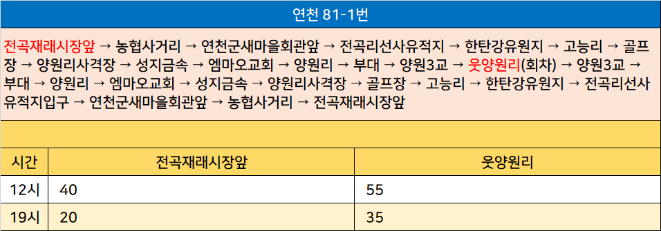 연천 81-1번: 전곡재래시장앞 → 농협사거리 → 연천군새마을회관앞 → 전곡리선사유적지 → 한탄강유원지 → 고능리 → 골프장 → 양원리사격장 → 성지금속 → 엠마오교회 → 양원리 → 부대 → 양원3교 → 웃양원리(회차) → 양원3교 → 부대 → 양원리 → 엠마오교회 → 성지금속 → 양원리사격장 → 골프장 → 고능리 → 한탄강유원지 → 전곡리선사유적지입구 → 연천군새마을회관앞 → 농협사거리 → 전곡재래시장앞
