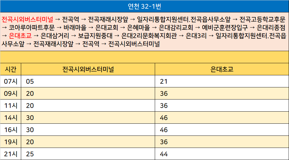 연천 32-1번: 전곡시외버스터미널 → 전곡역 → 전곡재래시장앞 → 일자리통합지원센터.전곡읍사무소앞 → 전곡고등학교후문 → 코아루아파트후문 → 바래마을 → 은대교회 → 은혜마을 → 은대감리교회 → 예비군훈련장입구 → 은대리종점 → 은대초교 → 은대삼거리 → 보급지원중대 → 은대2리문화복지회관 → 은대3리 → 일자리통합지원센터.전곡읍사무소앞 → 전곡재래시장앞 → 전곡역 → 전곡시외버스터미널