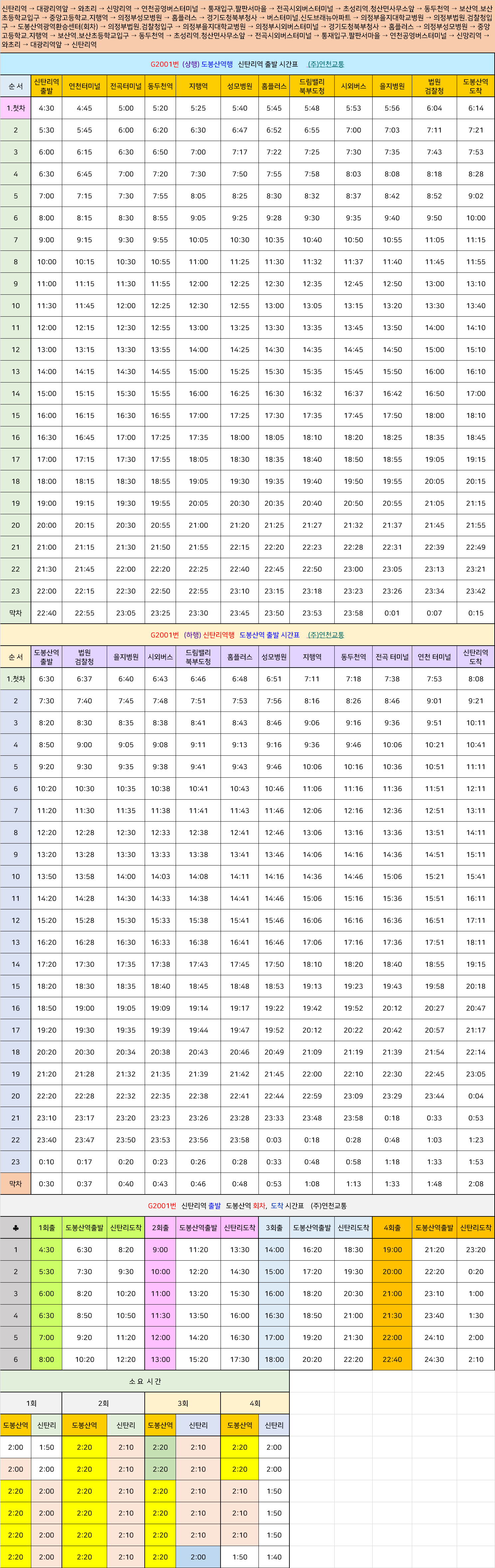 연천 G2001번: 신탄리역 → 대광리역앞 → 와초리 → 신망리역 → 연천공영버스터미널 → 통재입구.팔판서마을 → 전곡시외버스터미널 → 초성리역.청산면사무소앞 → 동두천역 → 보산역.보산초등학교입구 → 중앙고등학교.지행역 → 의정부성모병원 → 홈플러스 → 경기도청북부청사 → 버스터미널.신도브래뉴아파트 → 의정부을지대학교병원 → 의정부법원.검찰청입구 → 도봉산역광역환승센터(회차) → 의정부법원.검찰청입구 → 의정부을지대학교병원 → 의정부시외버스터미널 → 경기도청북부청사 → 홈플러스 → 의정부성모병원 → 중앙고등학교.지행역 → 보산역.보산초등학교입구 → 동두천역 → 초성리역.청산면사무소앞 → 전곡시외버스터미널 → 통재입구.팔판서마을 → 연천공영버스터미널 → 신망리역 → 와초리 → 대광리역앞 → 신탄리역