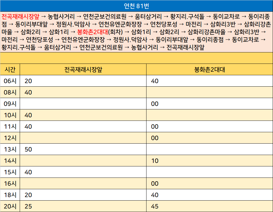 연천 81번: 전곡재래시장앞 → 농협사거리 → 연천군보건의료원 → 움터삼거리 → 황지리.구석돌 → 동이교차로 → 동이리종점 → 동이리부대앞 → 정원사.덕암사 → 연천유엔군화장장 → 연천당포성 → 마전리 → 삼화리3반 → 삼화리강촌마을 → 삼화2리 → 삼화1리 → 봉화촌2대대(회차) → 삼화1리 → 삼화2리 → 삼화리강촌마을 → 삼화리3반 → 마전리 → 연천당포성 → 연천유엔군화장장 → 정원사.덕암사 → 동이리부대앞 → 동이리종점 → 동이교차로 → 황지리.구석돌 → 움터삼거리 → 연천군보건의료원 → 농협사거리 → 전곡재래시장앞