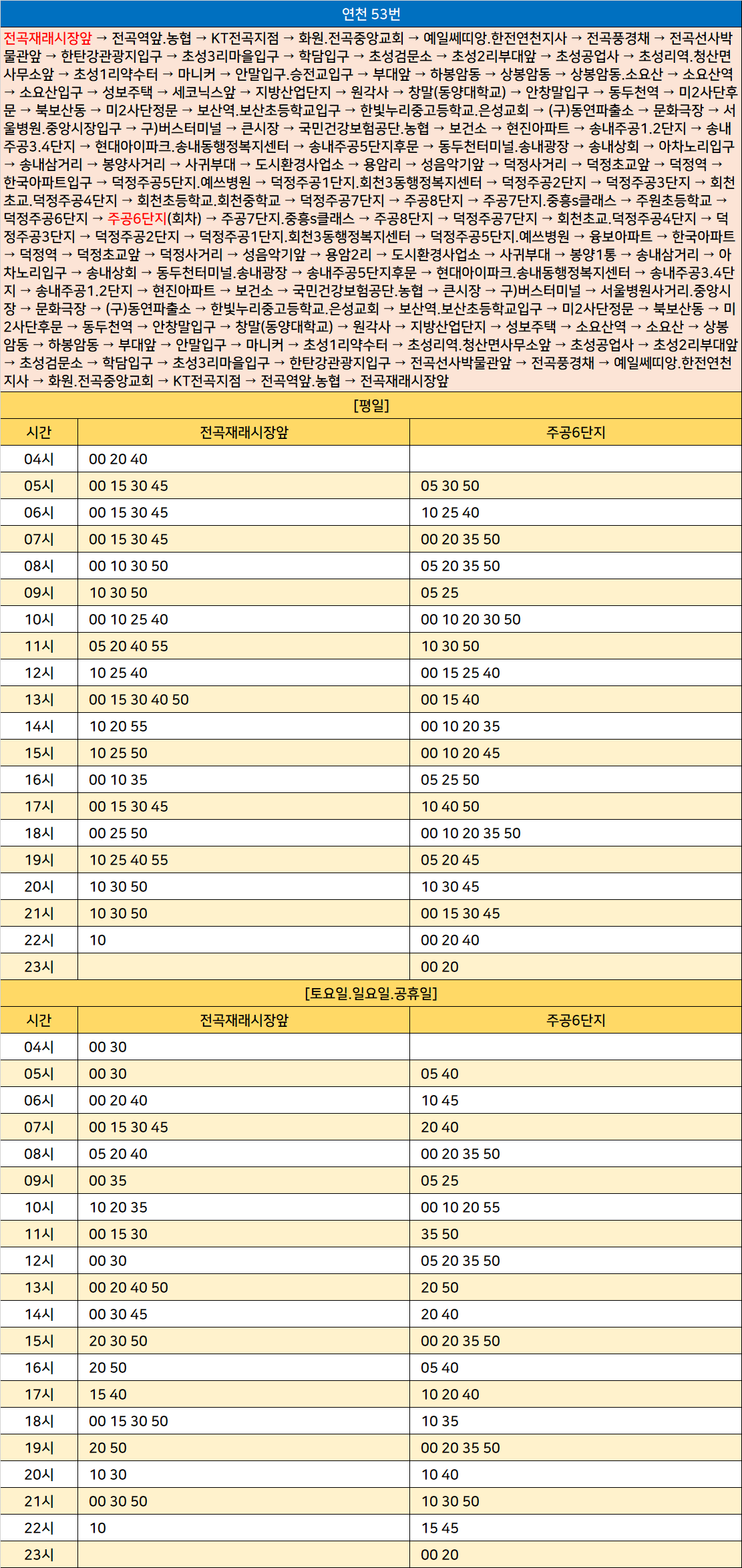 연천 53번: 전곡재래시장앞 → 전곡역앞.농협 → KT전곡지점 → 화원.전곡중앙교회 → 예일쎄띠앙.한전연천지사 → 전곡풍경채 → 전곡선사박물관앞 → 한탄강관광지입구 → 초성3리마을입구 → 학담입구 → 초성검문소 → 초성2리부대앞 → 초성공업사 → 초성리역.청산면사무소앞 → 초성1리약수터 → 마니커 → 안말입구.승전교입구 → 부대앞 → 하봉암동 → 상봉암동 → 상봉암동.소요산 → 소요산역 → 소요산입구 → 성보주택 → 세코닉스앞 → 지방산업단지 → 원각사 → 창말(동양대학교) → 안창말입구 → 동두천역 → 미2사단후문 → 북보산동 → 미2사단정문 → 보산역.보산초등학교입구 → 한빛누리중고등학교.은성교회 → (구)동연파출소 → 문화극장 → 서울병원.중앙시장입구 → 구)버스터미널 → 큰시장 → 국민건강보험공단.농협 → 보건소 → 현진아파트 → 송내주공1.2단지 → 송내주공3.4단지 → 현대아이파크.송내동행정복지센터 → 송내주공5단지후문 → 동두천터미널.송내광장 → 송내상회 → 아차노리입구 → 송내삼거리 → 봉양사거리 → 사귀부대 → 도시환경사업소 → 용암리 → 성음악기앞 → 덕정사거리 → 덕정초교앞 → 덕정역 → 한국아파트입구 → 덕정주공5단지.예쓰병원 → 덕정주공1단지.회천3동행정복지센터 → 덕정주공2단지 → 덕정주공3단지 → 회천초교.덕정주공4단지 → 회천초등학교.회천중학교 → 덕정주공7단지 → 주공8단지 → 주공7단지.중흥s클래스 → 주원초등학교 → 덕정주공6단지 → 주공6단지(회차) → 주공7단지.중흥s클래스 → 주공8단지 → 덕정주공7단지 → 회천초교.덕정주공4단지 → 덕정주공3단지 → 덕정주공2단지 → 덕정주공1단지.회천3동행정복지센터 → 덕정주공5단지.예쓰병원 → 융보아파트 → 한국아파트 → 덕정역 → 덕정초교앞 → 덕정사거리 → 성음악기앞 → 용암2리 → 도시환경사업소 → 사귀부대 → 봉양1통 → 송내삼거리 → 아차노리입구 → 송내상회 → 동두천터미널.송내광장 → 송내주공5단지후문 → 현대아이파크.송내동행정복지센터 → 송내주공3.4단지 → 송내주공1.2단지 → 현진아파트 → 보건소 → 국민건강보험공단.농협 → 큰시장 → 구)버스터미널 → 서울병원사거리.중앙시장 → 문화극장 → (구)동연파출소 → 한빛누리중고등학교.은성교회 → 보산역.보산초등학교입구 → 미2사단정문 → 북보산동 → 미2사단후문 → 동두천역 → 안창말입구 → 창말(동양대학교) → 원각사 → 지방산업단지 → 성보주택 → 소요산역 → 소요산 → 상봉암동 → 하봉암동 → 부대앞 → 안말입구 → 마니커 → 초성1리약수터 → 초성리역.청산면사무소앞 → 초성공업사 → 초성2리부대앞 → 초성검문소 → 학담입구 → 초성3리마을입구 → 한탄강관광지입구 → 전곡선사박물관앞 → 전곡풍경채 → 예일쎄띠앙.한전연천지사 → 화원.전곡중앙교회 → KT전곡지점 → 전곡역앞.농협 → 전곡재래시장앞