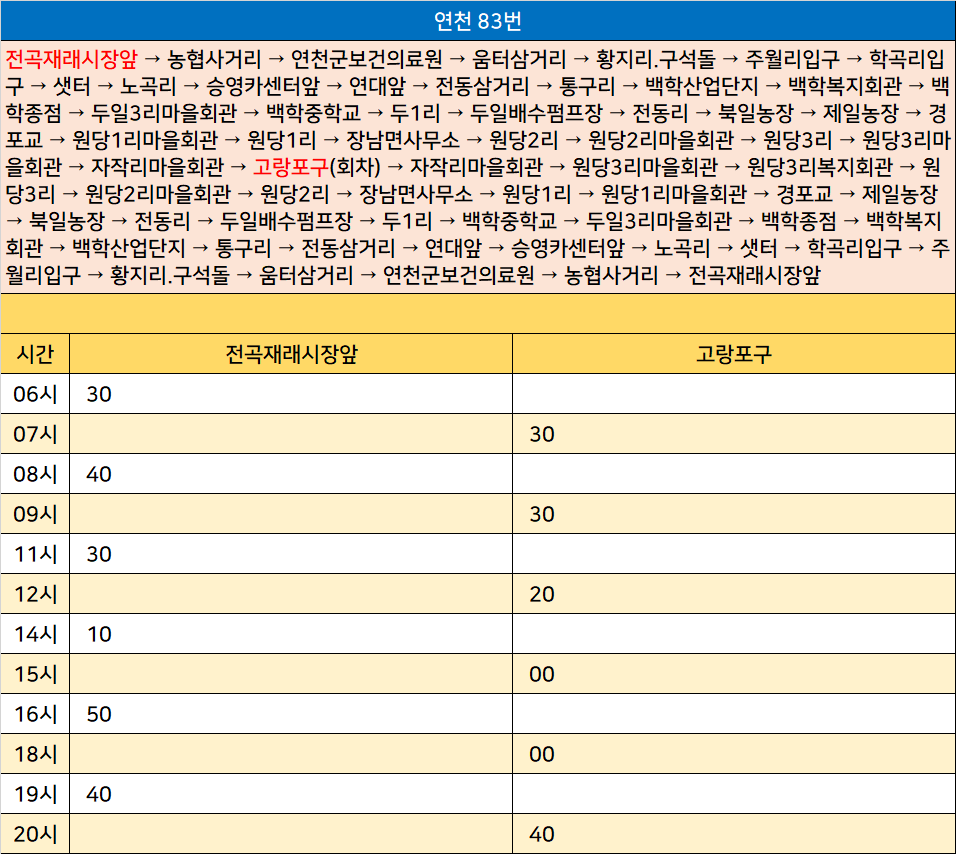 연천 83번: 전곡재래시장앞 → 농협사거리 → 연천군보건의료원 → 움터삼거리 → 황지리.구석돌 → 주월리입구 → 학곡리입구 → 샛터 → 노곡리 → 승영카센터앞 → 연대앞 → 전동삼거리 → 통구리 → 백학산업단지 → 백학복지회관 → 백학종점 → 두일3리마을회관 → 백학중학교 → 두1리 → 두일배수펌프장 → 전동리 → 북일농장 → 제일농장 → 경포교 → 원당1리마을회관 → 원당1리 → 장남면사무소 → 원당2리 → 원당2리마을회관 → 원당3리 → 원당3리마을회관 → 자작리마을회관 → 고랑포구(회차) → 자작리마을회관 → 원당3리마을회관 → 원당3리복지회관 → 원당3리 → 원당2리마을회관 → 원당2리 → 장남면사무소 → 원당1리 → 원당1리마을회관 → 경포교 → 제일농장 → 북일농장 → 전동리 → 두일배수펌프장 → 두1리 → 백학중학교 → 두일3리마을회관 → 백학종점 → 백학복지회관 → 백학산업단지 → 통구리 → 전동삼거리 → 연대앞 → 승영카센터앞 → 노곡리 → 샛터 → 학곡리입구 → 주월리입구 → 황지리.구석돌 → 움터삼거리 → 연천군보건의료원 → 농협사거리 → 전곡재래시장앞