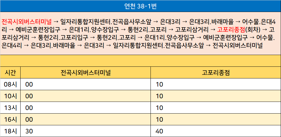 연천 38-1번: 전곡시외버스터미널 → 일자리통합지원센터.전곡읍사무소앞 → 은대3리 → 은대3리.바래마을 → 어수물.은대4리 → 예비군훈련장입구 → 은대1리.양수장입구 → 통현2리.고포리 → 고포리삼거리 → 고포리종점(회차) → 고포리삼거리 → 통현2리.고포리입구 → 통현2리.고포리 → 은대1리.양수장입구 → 예비군훈련장입구 → 어수물.은대4리 → 은대3리.바래마을 → 은대3리 → 일자리통합지원센터.전곡읍사무소앞 → 전곡시외버스터미널