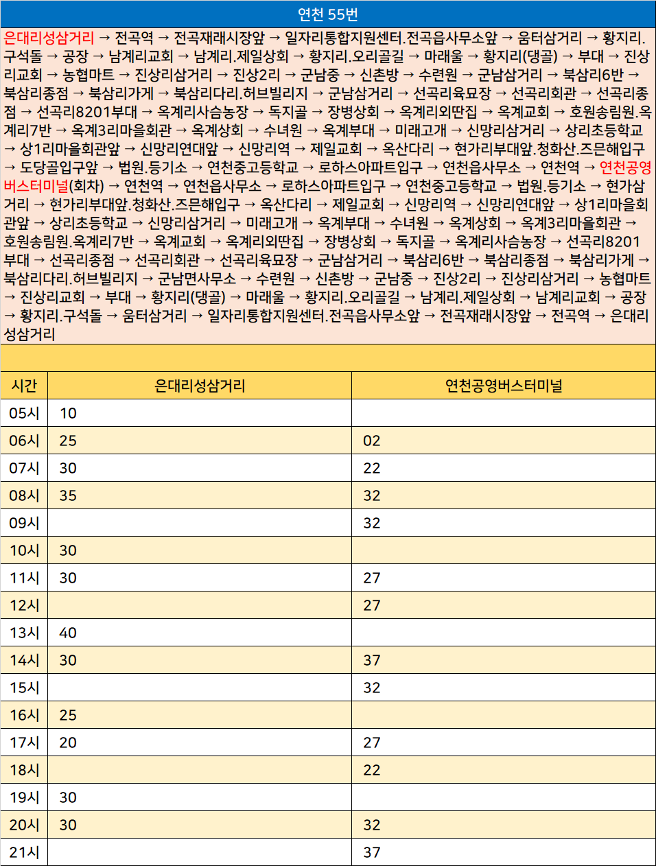 연천 55번: 은대리성삼거리 → 전곡역 → 전곡재래시장앞 → 일자리통합지원센터.전곡읍사무소앞 → 움터삼거리 → 황지리.구석돌 → 공장 → 남계리교회 → 남계리.제일상회 → 황지리.오리골길 → 마래울 → 황지리(댕골) → 부대 → 진상리교회 → 농협마트 → 진상리삼거리 → 진상2리 → 군남중 → 신촌방 → 수련원 → 군남삼거리 → 북삼리6반 → 북삼리종점 → 북삼리가게 → 북삼리다리.허브빌리지 → 군남삼거리 → 선곡리육묘장 → 선곡리회관 → 선곡리종점 → 선곡리8201부대 → 옥계리사슴농장 → 독지골 → 장병상회 → 옥계리외딴집 → 옥계교회 → 호원송림원.옥계리7반 → 옥계3리마을회관 → 옥계상회 → 수녀원 → 옥계부대 → 미래고개 → 신망리삼거리 → 상리초등학교 → 상1리마을회관앞 → 신망리연대앞 → 신망리역 → 제일교회 → 옥산다리 → 현가리부대앞.청화산.즈믄해입구 → 도당골입구앞 → 법원.등기소 → 연천중고등학교 → 로하스아파트입구 → 연천읍사무소 → 연천역 → 연천공영버스터미널(회차) → 연천역 → 연천읍사무소 → 로하스아파트입구 → 연천중고등학교 → 법원.등기소 → 현가삼거리 → 현가리부대앞.청화산.즈믄해입구 → 옥산다리 → 제일교회 → 신망리역 → 신망리연대앞 → 상1리마을회관앞 → 상리초등학교 → 신망리삼거리 → 미래고개 → 옥계부대 → 수녀원 → 옥계상회 → 옥계3리마을회관 → 호원송림원.옥계리7반 → 옥계교회 → 옥계리외딴집 → 장병상회 → 독지골 → 옥계리사슴농장 → 선곡리8201부대 → 선곡리종점 → 선곡리회관 → 선곡리육묘장 → 군남삼거리 → 북삼리6반 → 북삼리종점 → 북삼리가게 → 북삼리다리.허브빌리지 → 군남면사무소 → 수련원 → 신촌방 → 군남중 → 진상2리 → 진상리삼거리 → 농협마트 → 진상리교회 → 부대 → 황지리(댕골) → 마래울 → 황지리.오리골길 → 남계리.제일상회 → 남계리교회 → 공장 → 황지리.구석돌 → 움터삼거리 → 일자리통합지원센터.전곡읍사무소앞 → 전곡재래시장앞 → 전곡역 → 은대리성삼거리