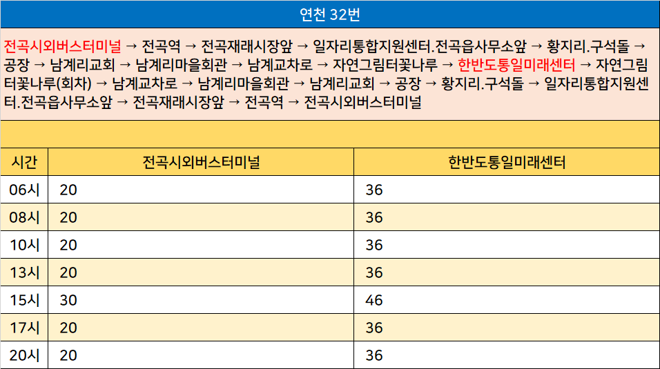 연천 32번: 전곡시외버스터미널 → 전곡역 → 전곡재래시장앞 → 일자리통합지원센터.전곡읍사무소앞 → 황지리.구석돌 → 공장 → 남계리교회 → 남계리마을회관 → 남계교차로 → 자연그림터꽃나루 → 한반도통일미래센터 → 자연그림터꽃나루(회차) → 남계교차로 → 남계리마을회관 → 남계리교회 → 공장 → 황지리.구석돌 → 일자리통합지원센터.전곡읍사무소앞 → 전곡재래시장앞 → 전곡역 → 전곡시외버스터미널