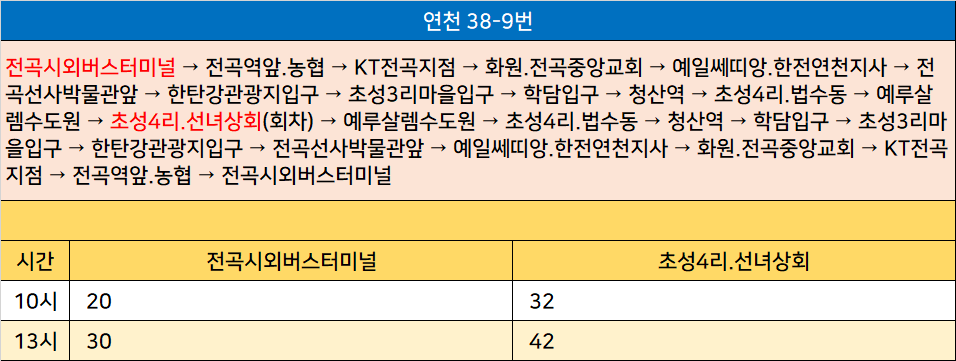 연천 38-9번: 전곡시외버스터미널 → 전곡역앞.농협 → KT전곡지점 → 화원.전곡중앙교회 → 예일쎄띠앙.한전연천지사 → 전곡선사박물관앞 → 한탄강관광지입구 → 초성3리마을입구 → 학담입구 → 청산역 → 초성4리.법수동 → 예루살렘수도원 → 초성4리.선녀상회(회차) → 예루살렘수도원 → 초성4리.법수동 → 청산역 → 학담입구 → 초성3리마을입구 → 한탄강관광지입구 → 전곡선사박물관앞 → 예일쎄띠앙.한전연천지사 → 화원.전곡중앙교회 → KT전곡지점 → 전곡역앞.농협 → 전곡시외버스터미널