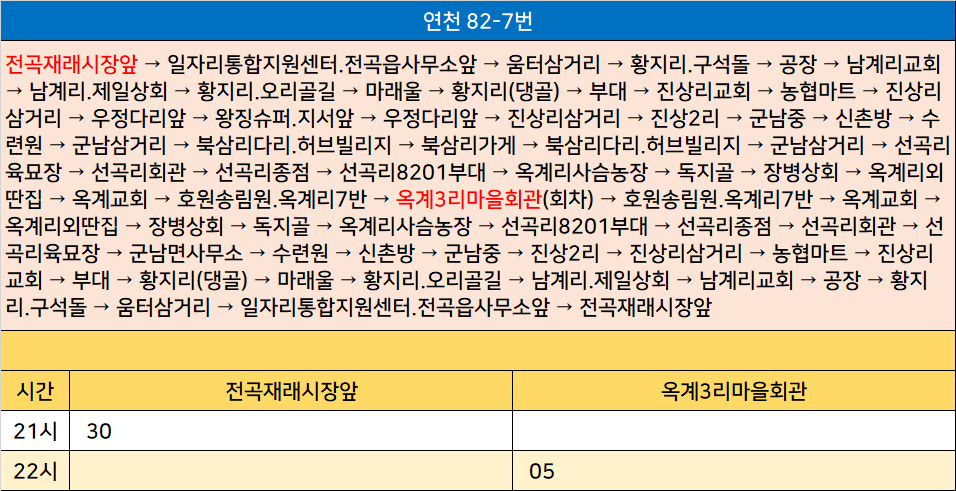 연천 82-7번: 전곡재래시장앞 → 일자리통합지원센터.전곡읍사무소앞 → 움터삼거리 → 황지리.구석돌 → 공장 → 남계리교회 → 남계리.제일상회 → 황지리.오리골길 → 마래울 → 황지리(댕골) → 부대 → 진상리교회 → 농협마트 → 진상리삼거리 → 우정다리앞 → 왕징슈퍼.지서앞 → 우정다리앞 → 진상리삼거리 → 진상2리 → 군남중 → 신촌방 → 수련원 → 군남삼거리 → 북삼리다리.허브빌리지 → 북삼리가게 → 북삼리다리.허브빌리지 → 군남삼거리 → 선곡리육묘장 → 선곡리회관 → 선곡리종점 → 선곡리8201부대 → 옥계리사슴농장 → 독지골 → 장병상회 → 옥계리외딴집 → 옥계교회 → 호원송림원.옥계리7반 → 옥계3리마을회관(회차) → 호원송림원.옥계리7반 → 옥계교회 → 옥계리외딴집 → 장병상회 → 독지골 → 옥계리사슴농장 → 선곡리8201부대 → 선곡리종점 → 선곡리회관 → 선곡리육묘장 → 군남면사무소 → 수련원 → 신촌방 → 군남중 → 진상2리 → 진상리삼거리 → 농협마트 → 진상리교회 → 부대 → 황지리(댕골) → 마래울 → 황지리.오리골길 → 남계리.제일상회 → 남계리교회 → 공장 → 황지리.구석돌 → 움터삼거리 → 일자리통합지원센터.전곡읍사무소앞 → 전곡재래시장앞