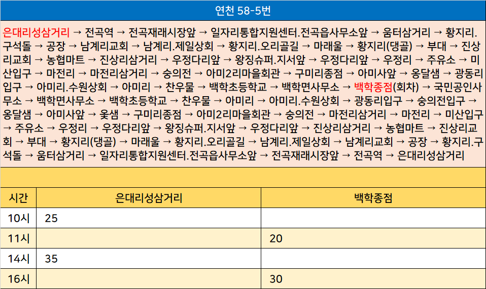 연천 58-5번: 은대리성삼거리 → 전곡역 → 전곡재래시장앞 → 일자리통합지원센터.전곡읍사무소앞 → 움터삼거리 → 황지리.구석돌 → 공장 → 남계리교회 → 남계리.제일상회 → 황지리.오리골길 → 마래울 → 황지리(댕골) → 부대 → 진상리교회 → 농협마트 → 진상리삼거리 → 우정다리앞 → 왕징슈퍼.지서앞 → 우정다리앞 → 우정리 → 주유소 → 미산입구 → 마전리 → 마전리삼거리 → 숭의전 → 아미2리마을회관 → 구미리종점 → 아미사앞 → 옹달샘 → 광동리입구 → 아미리.수원상회 → 아미리 → 찬우물 → 백학초등학교 → 백학면사무소 → 백학종점(회차) → 국민공인사무소 → 백학면사무소 → 백학초등학교 → 찬우물 → 아미리 → 아미리.수원상회 → 광동리입구 → 숭의전입구 → 옹달샘 → 아미사앞 → 옻샘 → 구미리종점 → 아미2리마을회관 → 숭의전 → 마전리삼거리 → 마전리 → 미산입구 → 주유소 → 우정리 → 우정다리앞 → 왕징슈퍼.지서앞 → 우정다리앞 → 진상리삼거리 → 농협마트 → 진상리교회 → 부대 → 황지리(댕골) → 마래울 → 황지리.오리골길 → 남계리.제일상회 → 남계리교회 → 공장 → 황지리.구석돌 → 움터삼거리 → 일자리통합지원센터.전곡읍사무소앞 → 전곡재래시장앞 → 전곡역 → 은대리성삼거리