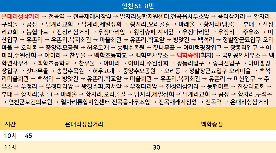 연천 58-8번: 은대리성삼거리 → 전곡역 → 전곡재래시장앞 → 일자리통합지원센터.전곡읍사무소앞 → 움터삼거리 → 황지리.구석돌 → 공장 → 남계리교회 → 남계리.제일상회 → 황지리.오리골길 → 마래울 → 황지리(댕골) → 부대 → 진상리교회 → 농협마트 → 진상리삼거리 → 우정다리앞 → 왕징슈퍼.지서앞 → 우정다리앞 → 우정리 → 주유소 → 미산입구 → 유촌리 → 유촌리.복지회관 → 마을회관 → 유촌리.학교앞 → 방앗간 → 백석리 → 정발장군묘입구.오리마을 → 오리동 → 중앙추모공원 → 허우고개 → 송림수목원 → 잣나무골 → 아미캠핑장입구 → 광동리입구 → 아미리.수원상회 → 아미리 → 찬우물 → 백학초등학교 → 백학면사무소 → 백학종점(회차) → 국민공인사무소 → 백학면사무소 → 백학초등학교 → 찬우물 → 아미리 → 아미리.수원상회 → 광동리입구 → 숭의전입구 → 아미캠핑장입구 → 잣나무골 → 송림수목원 → 허우고개 → 중앙추모공원 → 오리동 → 정발장군묘입구.오리마을 → 백석리마을회관 → 백석리 → 방앗간 → 유촌리.학교앞 → 마을회관 → 유촌리.복지회관 → 유촌리 → 미산입구 → 주유소 → 우정리 → 우정다리앞 → 왕징슈퍼.지서앞 → 우정다리앞 → 진상리삼거리 → 농협마트 → 진상리교회 → 부대 → 황지리(댕골) → 마래울 → 황지리.오리골길 → 남계리.제일상회 → 남계리교회 → 공장 → 황지리.구석돌 → 연천군보건의료원 → 일자리통합지원센터.전곡읍사무소앞 → 전곡재래시장앞 → 전곡역 → 은대리성삼거리