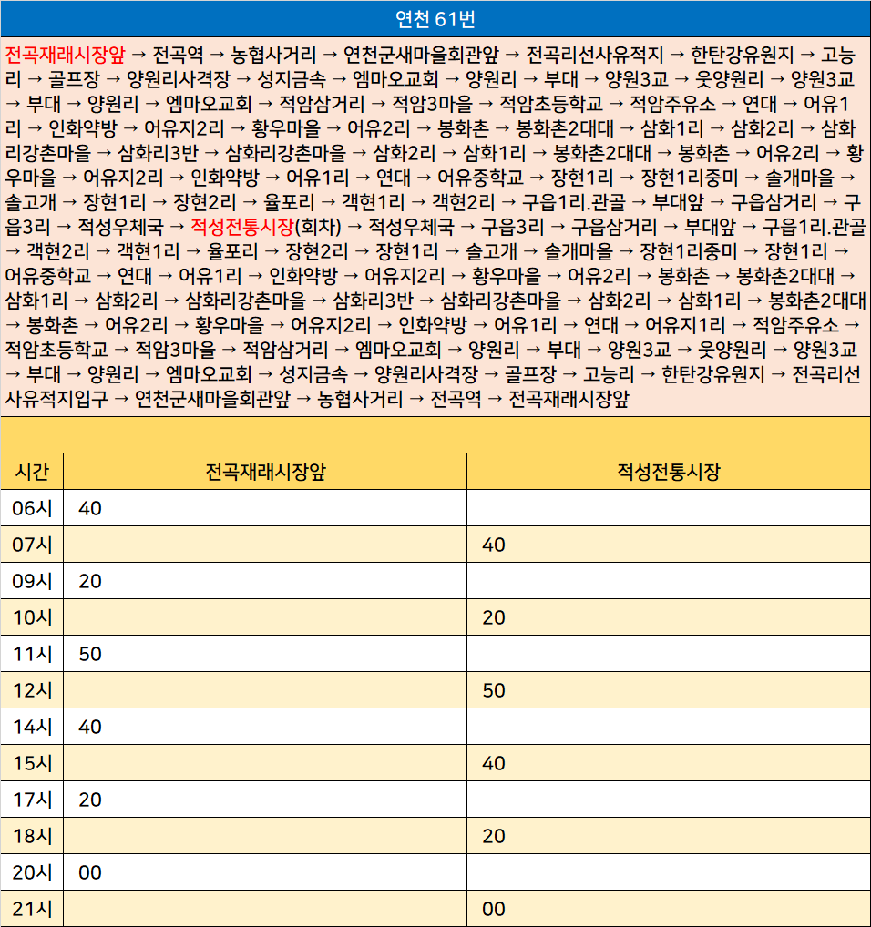 연천 61번: 전곡재래시장앞 → 전곡역 → 농협사거리 → 연천군새마을회관앞 → 전곡리선사유적지 → 한탄강유원지 → 고능리 → 골프장 → 양원리사격장 → 성지금속 → 엠마오교회 → 양원리 → 부대 → 양원3교 → 웃양원리 → 양원3교 → 부대 → 양원리 → 엠마오교회 → 적암삼거리 → 적암3마을 → 적암초등학교 → 적암주유소 → 연대 → 어유1리 → 인화약방 → 어유지2리 → 황우마을 → 어유2리 → 봉화촌 → 봉화촌2대대 → 삼화1리 → 삼화2리 → 삼화리강촌마을 → 삼화리3반 → 삼화리강촌마을 → 삼화2리 → 삼화1리 → 봉화촌2대대 → 봉화촌 → 어유2리 → 황우마을 → 어유지2리 → 인화약방 → 어유1리 → 연대 → 어유중학교 → 장현1리 → 장현1리중미 → 솔개마을 → 솔고개 → 장현1리 → 장현2리 → 율포리 → 객현1리 → 객현2리 → 구읍1리.관골 → 부대앞 → 구읍삼거리 → 구읍3리 → 적성우체국 → 적성전통시장(회차) → 적성우체국 → 구읍3리 → 구읍삼거리 → 부대앞 → 구읍1리.관골 → 객현2리 → 객현1리 → 율포리 → 장현2리 → 장현1리 → 솔고개 → 솔개마을 → 장현1리중미 → 장현1리 → 어유중학교 → 연대 → 어유1리 → 인화약방 → 어유지2리 → 황우마을 → 어유2리 → 봉화촌 → 봉화촌2대대 → 삼화1리 → 삼화2리 → 삼화리강촌마을 → 삼화리3반 → 삼화리강촌마을 → 삼화2리 → 삼화1리 → 봉화촌2대대 → 봉화촌 → 어유2리 → 황우마을 → 어유지2리 → 인화약방 → 어유1리 → 연대 → 어유지1리 → 적암주유소 → 적암초등학교 → 적암3마을 → 적암삼거리 → 엠마오교회 → 양원리 → 부대 → 양원3교 → 웃양원리 → 양원3교 → 부대 → 양원리 → 엠마오교회 → 성지금속 → 양원리사격장 → 골프장 → 고능리 → 한탄강유원지 → 전곡리선사유적지입구 → 연천군새마을회관앞 → 농협사거리 → 전곡역 → 전곡재래시장앞