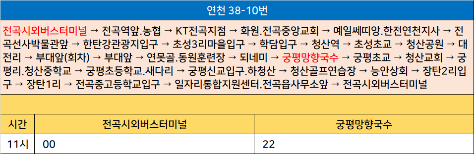 연천 38-10번: 전곡시외버스터미널 → 전곡역앞.농협 → KT전곡지점 → 화원.전곡중앙교회 → 예일쎄띠앙.한전연천지사 → 전곡선사박물관앞 → 한탄강관광지입구 → 초성3리마을입구 → 학담입구 → 청산역 → 초성초교 → 청산공원 → 대전리 → 부대앞(회차) → 부대앞 → 연못골.동원훈련장 → 되네미 → 궁평망향국수 → 궁평초교 → 청산교회 → 궁평리.청산중학교 → 궁평초등학교.새다리 → 궁평신교입구.하청산 → 청산골프연습장 → 능안상회 → 장탄2리입구 → 장탄1리 → 전곡중고등학교입구 → 일자리통합지원센터.전곡읍사무소앞 → 전곡시외버스터미널