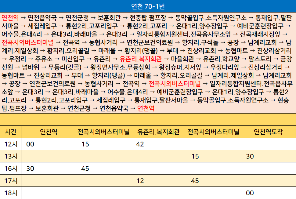 연천 70-1번: 연천역 → 연천읍약국 → 연천군청 → 보훈회관 → 현충탑.펌프장 → 동막골입구.소득자원연구소 → 통재입구.팔판서마을 → 세집레입구 → 통현2리.고포리입구 → 통현2리.고포리 → 은대1리.양수장입구 → 예비군훈련장입구 → 어수물.은대4리 → 은대3리.바래마을 → 은대3리 → 일자리통합지원센터.전곡읍사무소앞 → 전곡재래시장앞 → 전곡시외버스터미널 → 전곡역 → 농협사거리 → 연천군보건의료원 → 황지리.구석돌 → 공장 → 남계리교회 → 남계리.제일상회 → 황지리.오리골길 → 마래울 → 황지리(댕골) → 부대 → 진상리교회 → 농협마트 → 진상리삼거리 → 우정리 → 주유소 → 미산입구 → 유촌리 → 유촌리.복지회관 → 마을회관 → 유촌리.학교앞 → 팜스토리 → 금강선원 → 넘바위 → 무등리(갓골) → 왕징면사무소.무등상회 → 왕징슈퍼.지서앞 → 우정다리앞 → 진상리삼거리 → 농협마트 → 진상리교회 → 부대 → 황지리(댕골) → 마래울 → 황지리.오리골길 → 남계리.제일상회 → 남계리교회 → 공장 → 연천군보건의료원 → 농협사거리 → 전곡역 → 전곡시외버스터미널 → 일자리통합지원센터.전곡읍사무소앞 → 은대3리 → 은대3리.바래마을 → 어수물.은대4리 → 예비군훈련장입구 → 은대1리.양수장입구 → 통현2리.고포리 → 통현2리.고포리입구 → 세집레입구 → 통재입구.팔판서마을 → 동막골입구.소득자원연구소 → 현충탑.펌프장 → 보훈회관 → 연천군청 → 연천읍약국 → 연천역
