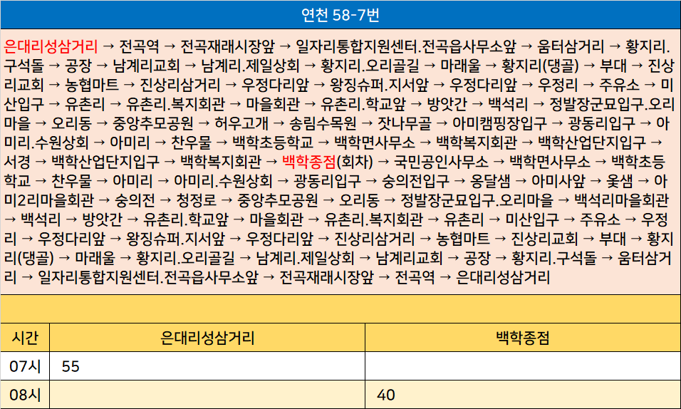 연천 58-7번: 은대리성삼거리 → 전곡역 → 전곡재래시장앞 → 일자리통합지원센터.전곡읍사무소앞 → 움터삼거리 → 황지리.구석돌 → 공장 → 남계리교회 → 남계리.제일상회 → 황지리.오리골길 → 마래울 → 황지리(댕골) → 부대 → 진상리교회 → 농협마트 → 진상리삼거리 → 우정다리앞 → 왕징슈퍼.지서앞 → 우정다리앞 → 우정리 → 주유소 → 미산입구 → 유촌리 → 유촌리.복지회관 → 마을회관 → 유촌리.학교앞 → 방앗간 → 백석리 → 정발장군묘입구.오리마을 → 오리동 → 중앙추모공원 → 허우고개 → 송림수목원 → 잣나무골 → 아미캠핑장입구 → 광동리입구 → 아미리.수원상회 → 아미리 → 찬우물 → 백학초등학교 → 백학면사무소 → 백학복지회관 → 백학산업단지입구 → 서경 → 백학산업단지입구 → 백학복지회관 → 백학종점(회차) → 국민공인사무소 → 백학면사무소 → 백학초등학교 → 찬우물 → 아미리 → 아미리.수원상회 → 광동리입구 → 숭의전입구 → 옹달샘 → 아미사앞 → 옻샘 → 아미2리마을회관 → 숭의전 → 청정로 → 중앙추모공원 → 오리동 → 정발장군묘입구.오리마을 → 백석리마을회관 → 백석리 → 방앗간 → 유촌리.학교앞 → 마을회관 → 유촌리.복지회관 → 유촌리 → 미산입구 → 주유소 → 우정리 → 우정다리앞 → 왕징슈퍼.지서앞 → 우정다리앞 → 진상리삼거리 → 농협마트 → 진상리교회 → 부대 → 황지리(댕골) → 마래울 → 황지리.오리골길 → 남계리.제일상회 → 남계리교회 → 공장 → 황지리.구석돌 → 움터삼거리 → 일자리통합지원센터.전곡읍사무소앞 → 전곡재래시장앞 → 전곡역 → 은대리성삼거리