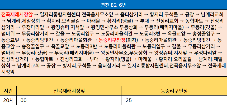 연천 82-6번: 전곡재래시장앞 → 일자리통합지원센터.전곡읍사무소앞 → 움터삼거리 → 황지리.구석돌 → 공장 → 남계리교회 → 남계리.제일상회 → 황지리.오리골길 → 마래울 → 황지리(댕골) → 부대 → 진상리교회 → 농협마트 → 진상리삼거리 → 우정다리앞 → 왕징슈퍼.지서앞 → 왕징면사무소.무등상회 → 무등리(패키지마을) → 무등리(갓골) → 넘바위 → 무등리삼거리 → 갈울 → 노동리입구 → 노동리마을회관 → 노동리3반 → 옥골교앞 → 송정골입구 → 동중교앞 → 동중리방앗간 → 동중리마을회관 → 동중리구판장(회차) → 동중리마을회관 → 동중리방앗간 → 동중교앞 → 송정골입구 → 옥골교앞 → 노동리3반 → 노동리마을회관 → 노동리입구 → 갈울 → 무등리삼거리 → 넘바위 → 무등리(갓골) → 무등리(패키지마을) → 왕징면사무소.무등상회 → 왕징슈퍼.지서앞 → 우정다리앞 → 진상리삼거리 → 농협마트 → 진상리교회 → 부대 → 황지리(댕골) → 마래울 → 황지리.오리골길 → 남계리.제일상회 → 남계리교회 → 공장 → 황지리.구석돌 → 움터삼거리 → 일자리통합지원센터.전곡읍사무소앞 → 전곡재래시장앞