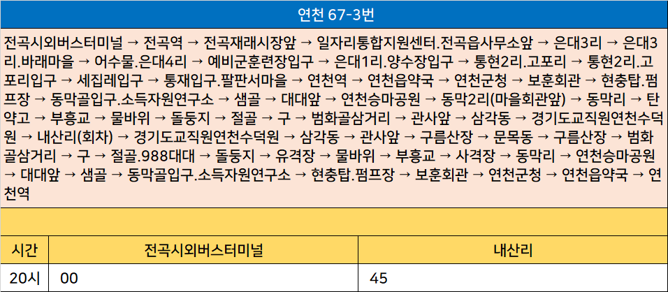 연천 67-3번: 전곡시외버스터미널 → 전곡역 → 전곡재래시장앞 → 일자리통합지원센터.전곡읍사무소앞 → 은대3리 → 은대3리.바래마을 → 어수물.은대4리 → 예비군훈련장입구 → 은대1리.양수장입구 → 통현2리.고포리 → 통현2리.고포리입구 → 세집레입구 → 통재입구.팔판서마을 → 연천역 → 연천읍약국 → 연천군청 → 보훈회관 → 현충탑.펌프장 → 동막골입구.소득자원연구소 → 샘골 → 대대앞 → 연천승마공원 → 동막2리(마을회관앞) → 동막리 → 탄약고 → 부흥교 → 물바위 → 돌둥지 → 절골 → 구 → 범화골삼거리 → 관사앞 → 삼각동 → 경기도교직원연천수덕원 → 내산리(회차) → 경기도교직원연천수덕원 → 삼각동 → 관사앞 → 구름산장 → 문목동 → 구름산장 → 범화골삼거리 → 구 → 절골.988대대 → 돌둥지 → 유격장 → 물바위 → 부흥교 → 사격장 → 동막리 → 연천승마공원 → 대대앞 → 샘골 → 동막골입구.소득자원연구소 → 현충탑.펌프장 → 보훈회관 → 연천군청 → 연천읍약국 → 연천역