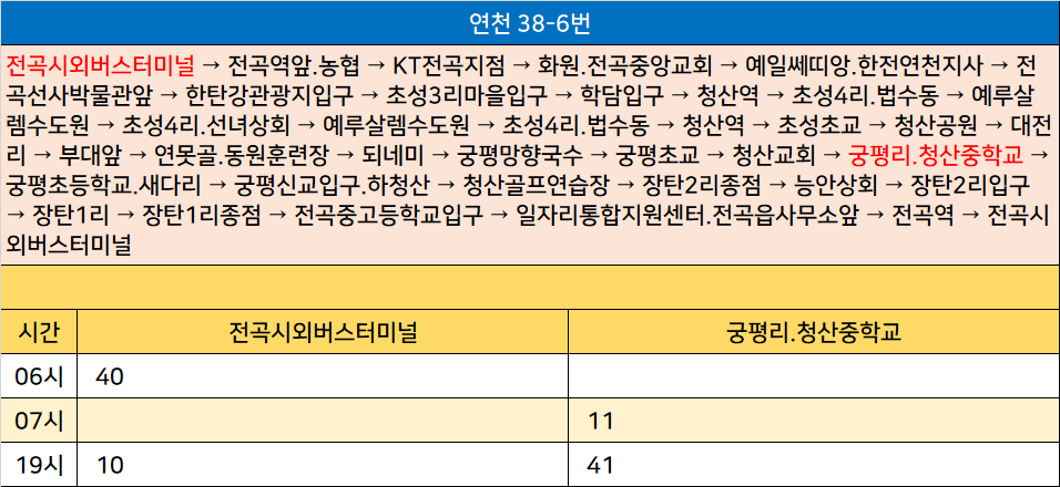 연천 38-6번: 전곡시외버스터미널 → 전곡역앞.농협 → KT전곡지점 → 화원.전곡중앙교회 → 예일쎄띠앙.한전연천지사 → 전곡선사박물관앞 → 한탄강관광지입구 → 초성3리마을입구 → 학담입구 → 청산역 → 초성4리.법수동 → 예루살렘수도원 → 초성4리.선녀상회 → 예루살렘수도원 → 초성4리.법수동 → 청산역 → 초성초교 → 청산공원 → 대전리 → 부대앞 → 연못골.동원훈련장 → 되네미 → 궁평망향국수 → 궁평초교 → 청산교회 → 궁평리.청산중학교 → 궁평초등학교.새다리 → 궁평신교입구.하청산 → 청산골프연습장 → 장탄2리종점 → 능안상회 → 장탄2리입구 → 장탄1리 → 장탄1리종점 → 전곡중고등학교입구 → 일자리통합지원센터.전곡읍사무소앞 → 전곡역 → 전곡시외버스터미널