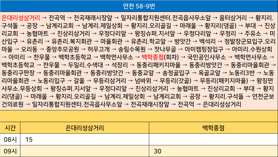연천 58-9번: 은대리성삼거리 → 전곡역 → 전곡재래시장앞 → 일자리통합지원센터.전곡읍사무소앞 → 움터삼거리 → 황지리.구석돌 → 공장 → 남계리교회 → 남계리.제일상회 → 황지리.오리골길 → 마래울 → 황지리(댕골) → 부대 → 진상리교회 → 농협마트 → 진상리삼거리 → 우정다리앞 → 왕징슈퍼.지서앞 → 우정다리앞 → 우정리 → 주유소 → 미산입구 → 유촌리 → 유촌리.복지회관 → 마을회관 → 유촌리.학교앞 → 방앗간 → 백석리 → 정발장군묘입구.오리마을 → 오리동 → 중앙추모공원 → 허우고개 → 송림수목원 → 잣나무골 → 아미캠핑장입구 → 아미리.수원상회 → 아미리 → 찬우물 → 백학초등학교 → 백학면사무소 → 백학종점(회차) → 국민공인사무소 → 백학면사무소 → 백학초등학교 → 찬우물 → 두일리.수색대 → 석장리 → 동중리패키지마을 → 동중리방앗간 → 동중리마을회관 → 동중리구판장 → 동중리마을회관 → 동중리방앗간 → 동중교앞 → 송정골입구 → 옥골교앞 → 노동리3반 → 노동리마을회관 → 노동리입구 → 갈울 → 무등리삼거리 → 넘바위 → 무등리(갓골) → 무등리(패키지마을) → 왕징면사무소.무등상회 → 왕징슈퍼.지서앞 → 우정다리앞 → 진상리삼거리 → 농협마트 → 진상리교회 → 부대 → 황지리(댕골) → 마래울 → 황지리.오리골길 → 남계리.제일상회 → 남계리교회 → 공장 → 황지리.구석돌 → 연천군보건의료원 → 일자리통합지원센터.전곡읍사무소앞 → 전곡재래시장앞 → 전곡역 → 은대리성삼거리
