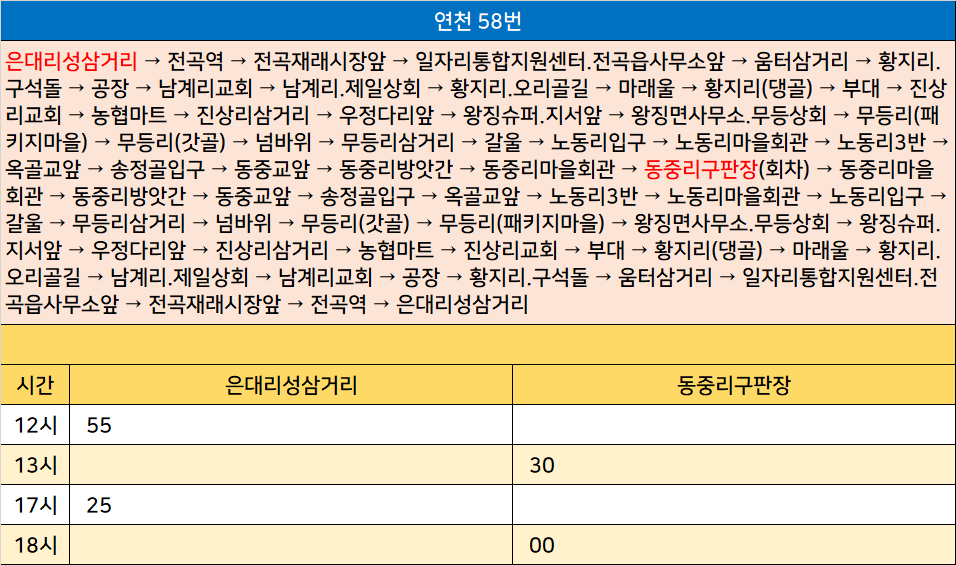 연천 58번: 은대리성삼거리 → 전곡역 → 전곡재래시장앞 → 일자리통합지원센터.전곡읍사무소앞 → 움터삼거리 → 황지리.구석돌 → 공장 → 남계리교회 → 남계리.제일상회 → 황지리.오리골길 → 마래울 → 황지리(댕골) → 부대 → 진상리교회 → 농협마트 → 진상리삼거리 → 우정다리앞 → 왕징슈퍼.지서앞 → 왕징면사무소.무등상회 → 무등리(패키지마을) → 무등리(갓골) → 넘바위 → 무등리삼거리 → 갈울 → 노동리입구 → 노동리마을회관 → 노동리3반 → 옥골교앞 → 송정골입구 → 동중교앞 → 동중리방앗간 → 동중리마을회관 → 동중리구판장(회차) → 동중리마을회관 → 동중리방앗간 → 동중교앞 → 송정골입구 → 옥골교앞 → 노동리3반 → 노동리마을회관 → 노동리입구 → 갈울 → 무등리삼거리 → 넘바위 → 무등리(갓골) → 무등리(패키지마을) → 왕징면사무소.무등상회 → 왕징슈퍼.지서앞 → 우정다리앞 → 진상리삼거리 → 농협마트 → 진상리교회 → 부대 → 황지리(댕골) → 마래울 → 황지리.오리골길 → 남계리.제일상회 → 남계리교회 → 공장 → 황지리.구석돌 → 움터삼거리 → 일자리통합지원센터.전곡읍사무소앞 → 전곡재래시장앞 → 전곡역 → 은대리성삼거리