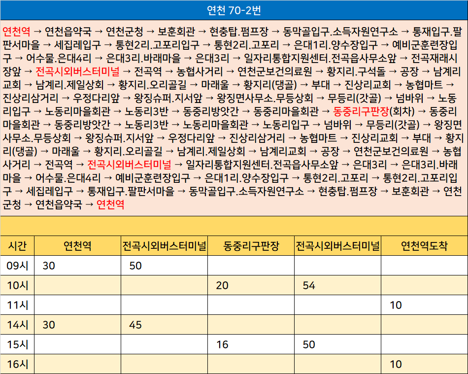 연천 70-2번: 연천역 → 연천읍약국 → 연천군청 → 보훈회관 → 현충탑.펌프장 → 동막골입구.소득자원연구소 → 통재입구.팔판서마을 → 세집레입구 → 통현2리.고포리입구 → 통현2리.고포리 → 은대1리.양수장입구 → 예비군훈련장입구 → 어수물.은대4리 → 은대3리.바래마을 → 은대3리 → 일자리통합지원센터.전곡읍사무소앞 → 전곡재래시장앞 → 전곡시외버스터미널 → 전곡역 → 농협사거리 → 연천군보건의료원 → 황지리.구석돌 → 공장 → 남계리교회 → 남계리.제일상회 → 황지리.오리골길 → 마래울 → 황지리(댕골) → 부대 → 진상리교회 → 농협마트 → 진상리삼거리 → 우정다리앞 → 왕징슈퍼.지서앞 → 왕징면사무소.무등상회 → 무등리(갓골) → 넘바위 → 노동리입구 → 노동리마을회관 → 노동리3반 → 동중리방앗간 → 동중리마을회관 → 동중리구판장(회차) → 동중리마을회관 → 동중리방앗간 → 노동리3반 → 노동리마을회관 → 노동리입구 → 넘바위 → 무등리(갓골) → 왕징면사무소.무등상회 → 왕징슈퍼.지서앞 → 우정다리앞 → 진상리삼거리 → 농협마트 → 진상리교회 → 부대 → 황지리(댕골) → 마래울 → 황지리.오리골길 → 남계리.제일상회 → 남계리교회 → 공장 → 연천군보건의료원 → 농협사거리 → 전곡역 → 전곡시외버스터미널 → 일자리통합지원센터.전곡읍사무소앞 → 은대3리 → 은대3리.바래마을 → 어수물.은대4리 → 예비군훈련장입구 → 은대1리.양수장입구 → 통현2리.고포리 → 통현2리.고포리입구 → 세집레입구 → 통재입구.팔판서마을 → 동막골입구.소득자원연구소 → 현충탑.펌프장 → 보훈회관 → 연천군청 → 연천읍약국 → 연천역