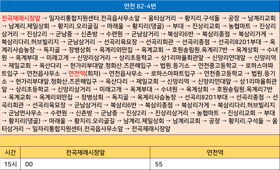 연천 82-4번: 전곡재래시장앞 → 일자리통합지원센터.전곡읍사무소앞 → 움터삼거리 → 황지리.구석돌 → 공장 → 남계리교회 → 남계리.제일상회 → 황지리.오리골길 → 마래울 → 황지리(댕골) → 부대 → 진상리교회 → 농협마트 → 진상리삼거리 → 진상2리 → 군남중 → 신촌방 → 수련원 → 군남삼거리 → 북삼리6반 → 북삼리종점 → 북삼리가게 → 북삼리다리.허브빌리지 → 군남삼거리 → 선곡리육묘장 → 선곡리회관 → 선곡리종점 → 선곡리8201부대 → 옥계리사슴농장 → 독지골 → 장병상회 → 옥계리외딴집 → 옥계교회 → 호원송림원.옥계리7반 → 옥계상회 → 수녀원 → 옥계부대 → 미래고개 → 신망리삼거리 → 상리초등학교 → 상1리마을회관앞 → 신망리연대앞 → 신망리역 → 제일교회 → 옥산다리 → 현가리부대앞.청화산.즈믄해입구 → 법원.등기소 → 연천중고등학교 → 로하스아파트입구 → 연천읍사무소 → 연천역(회차) → 연천읍사무소 → 로하스아파트입구 → 연천중고등학교 → 법원.등기소 → 현가리부대앞.청화산.즈믄해입구 → 옥산다리 → 제일교회 → 신망리역 → 신망리연대앞 → 상1리마을회관앞 → 상리초등학교 → 신망리삼거리 → 미래고개 → 옥계부대 → 수녀원 → 옥계상회 → 호원송림원.옥계리7반 → 옥계교회 → 옥계리외딴집 → 장병상회 → 독지골 → 옥계리사슴농장 → 선곡리8201부대 → 선곡리종점 → 선곡리회관 → 선곡리육묘장 → 군남삼거리 → 북삼리6반 → 북삼리종점 → 북삼리가게 → 북삼리다리.허브빌리지 → 군남면사무소 → 수련원 → 신촌방 → 군남중 → 진상2리 → 진상리삼거리 → 농협마트 → 진상리교회 → 부대 → 황지리(댕골) → 마래울 → 황지리.오리골길 → 남계리.제일상회 → 남계리교회 → 공장 → 황지리.구석돌 → 움터삼거리 → 일자리통합지원센터.전곡읍사무소앞 → 전곡재래시장앞