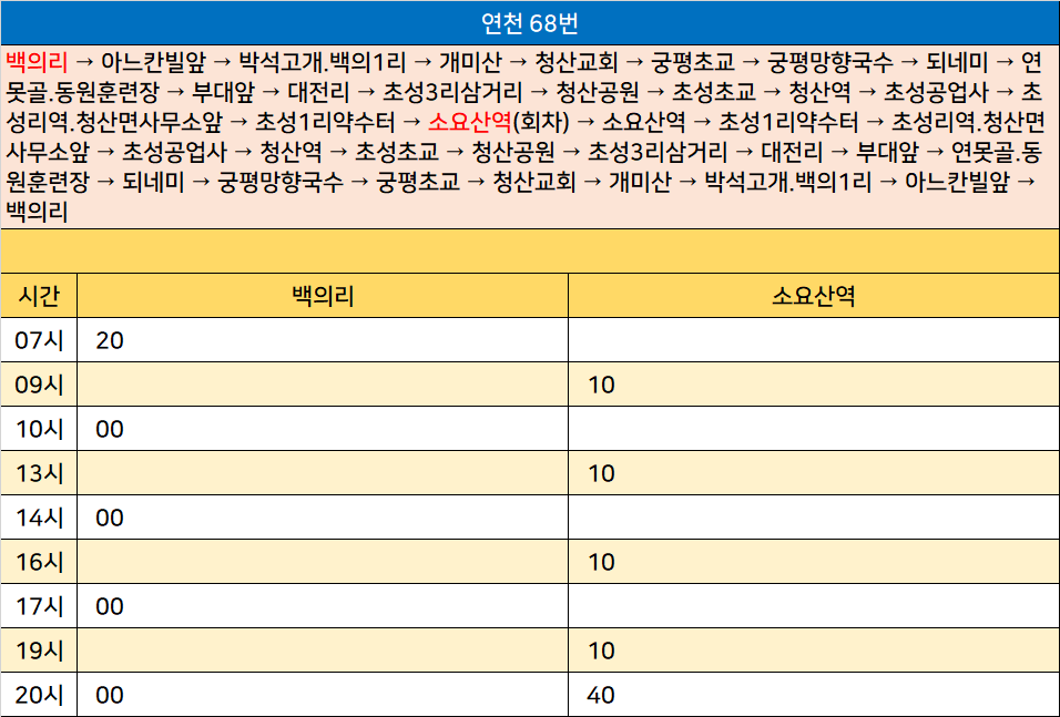 연천 68번: 백의리 → 아느칸빌앞 → 박석고개.백의1리 → 개미산 → 청산교회 → 궁평초교 → 궁평망향국수 → 되네미 → 연못골.동원훈련장 → 부대앞 → 대전리 → 초성3리삼거리 → 청산공원 → 초성초교 → 청산역 → 초성공업사 → 초성리역.청산면사무소앞 → 초성1리약수터 → 소요산역(회차) → 소요산역 → 초성1리약수터 → 초성리역.청산면사무소앞 → 초성공업사 → 청산역 → 초성초교 → 청산공원 → 초성3리삼거리 → 대전리 → 부대앞 → 연못골.동원훈련장 → 되네미 → 궁평망향국수 → 궁평초교 → 청산교회 → 개미산 → 박석고개.백의1리 → 아느칸빌앞 → 백의리
