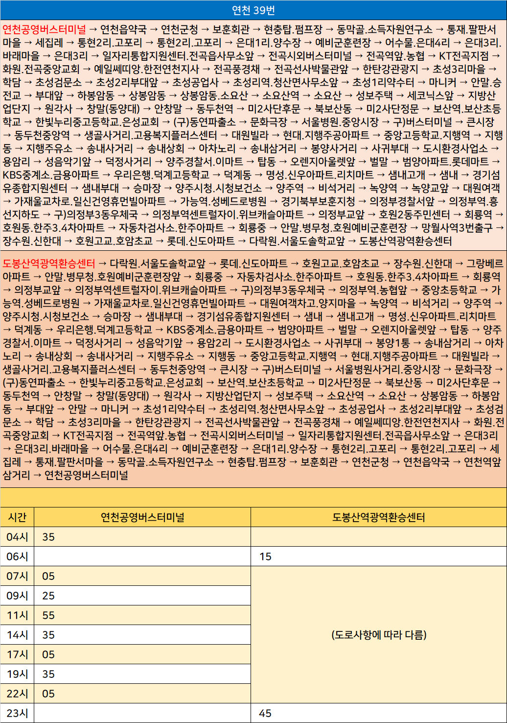 연천 39번: 연천공영버스터미널 → 연천읍약국 → 연천군청 → 보훈회관 → 현충탑.펌프장 → 동막골.소득자원연구소 → 통재.팔판서마을 → 세집레 → 통현2리.고포리 → 통현2리.고포리 → 은대1리.양수장 → 예비군훈련장 → 어수물.은대4리 → 은대3리.바래마을 → 은대3리 → 일자리통합지원센터.전곡읍사무소앞 → 전곡시외버스터미널 → 전곡역앞.농협 → KT전곡지점 → 화원.전곡중앙교회 → 예일쎄띠앙.한전연천지사 → 전곡풍경채 → 전곡선사박물관앞 → 한탄강관광지 → 초성3리마을 → 학담 → 초성검문소 → 초성2리부대앞 → 초성공업사 → 초성리역.청산면사무소앞 → 초성1리약수터 → 마니커 → 안말.승전교 → 부대앞 → 하봉암동 → 상봉암동 → 상봉암동.소요산 → 소요산역 → 소요산 → 성보주택 → 세코닉스앞 → 지방산업단지 → 원각사 → 창말(동양대) → 안창말 → 동두천역 → 미2사단후문 → 북보산동 → 미2사단정문 → 보산역.보산초등학교 → 한빛누리중고등학교.은성교회 → (구)동연파출소 → 문화극장 → 서울병원.중앙시장 → 구)버스터미널 → 큰시장 → 동두천중앙역 → 생골사거리.고용복지플러스센터 → 대원빌라 → 현대.지행주공아파트 → 중앙고등학교.지행역 → 지행동 → 지행주유소 → 송내사거리 → 송내상회 → 아차노리 → 송내삼거리 → 봉양사거리 → 사귀부대 → 도시환경사업소 → 용암리 → 성음악기앞 → 덕정사거리 → 양주경찰서.이마트 → 탑동 → 오렌지아울렛앞 → 벌말 → 범양아파트.롯데마트 → KBS중계소.금용아파트 → 우리은행.덕계고등학교 → 덕계동 → 명성.신우아파트.리치마트 → 샘내고개 → 샘내 → 경기섬유종합지원센터 → 샘내부대 → 승마장 → 양주시청.시청보건소 → 양주역 → 비석거리 → 녹양역 → 녹양교앞 → 대원여객 → 가재울교차로.일신건영휴먼빌아파트 → 가능역.성베드로병원 → 경기북부보훈지청 → 의정부경찰서앞 → 의정부역.흥선지하도 → 구)의정부3동우체국 → 의정부역센트럴자이.위브캐슬아파트 → 의정부교앞 → 호원2동주민센터 → 회룡역 → 호원동.한주3.4차아파트 → 자동차검사소.한주아파트 → 회룡중 → 안말.병무청.호원예비군훈련장 → 망월사역3번출구 → 장수원.신한대 → 호원고교.호암초교 → 롯데.신도아파트 → 다락원.서울도솔학교앞 → 도봉산역광역환승센터(회차) → 다락원.서울도솔학교앞 → 롯데.신도아파트 → 호원고교.호암초교 → 장수원.신한대 → 그랑베르아파트 → 안말.병무청.호원예비군훈련장앞 → 회룡중 → 자동차검사소.한주아파트 → 호원동.한주3.4차아파트 → 회룡역 → 의정부교앞 → 의정부역센트럴자이.위브캐슬아파트 → 구)의정부3동우체국 → 의정부역.농협앞 → 중앙초등학교 → 가능역.성베드로병원 → 가재울교차로.일신건영휴먼빌아파트 → 대원여객차고.양지마을 → 녹양역 → 비석거리 → 양주역 → 양주시청.시청보건소 → 승마장 → 샘내부대 → 경기섬유종합지원센터 → 샘내 → 샘내고개 → 명성.신우아파트.리치마트 → 덕계동 → 우리은행.덕계고등학교 → KBS중계소.금용아파트 → 범양아파트 → 벌말 → 오렌지아울렛앞 → 탑동 → 양주경찰서.이마트 → 덕정사거리 → 성음악기앞 → 용암2리 → 도시환경사업소 → 사귀부대 → 봉양1통 → 송내삼거리 → 아차노리 → 송내상회 → 송내사거리 → 지행주유소 → 지행동 → 중앙고등학교.지행역 → 현대.지행주공아파트 → 대원빌라 → 생골사거리.고용복지플러스센터 → 동두천중앙역 → 큰시장 → 구)버스터미널 → 서울병원사거리.중앙시장 → 문화극장 → (구)동연파출소 → 한빛누리중고등학교.은성교회 → 보산역.보산초등학교 → 미2사단정문 → 북보산동 → 미2사단후문 → 동두천역 → 안창말 → 창말(동양대) → 원각사 → 지방산업단지 → 성보주택 → 소요산역 → 소요산 → 상봉암동 → 하봉암동 → 부대앞 → 안말 → 마니커 → 초성1리약수터 → 초성리역.청산면사무소앞 → 초성공업사 → 초성2리부대앞 → 초성검문소 → 학담 → 초성3리마을 → 한탄강관광지 → 전곡선사박물관앞 → 전곡풍경채 → 예일쎄띠앙.한전연천지사 → 화원.전곡중앙교회 → KT전곡지점 → 전곡역앞.농협 → 전곡시외버스터미널 → 일자리통합지원센터.전곡읍사무소앞 → 은대3리 → 은대3리.바래마을 → 어수물.은대4리 → 예비군훈련장 → 은대1리.양수장 → 통현2리.고포리 → 통현2리.고포리 → 세집레 → 통재.팔판서마을 → 동막골.소득자원연구소 → 현충탑.펌프장 → 보훈회관 → 연천군청 → 연천읍약국 → 연천역앞삼거리 → 연천공영버스터미널