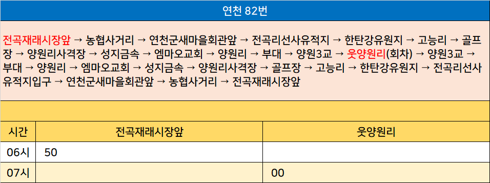 연천 82번: 전곡재래시장앞 → 농협사거리 → 연천군새마을회관앞 → 전곡리선사유적지 → 한탄강유원지 → 고능리 → 골프장 → 양원리사격장 → 성지금속 → 엠마오교회 → 양원리 → 부대 → 양원3교 → 웃양원리(회차) → 양원3교 → 부대 → 양원리 → 엠마오교회 → 성지금속 → 양원리사격장 → 골프장 → 고능리 → 한탄강유원지 → 전곡리선사유적지입구 → 연천군새마을회관앞 → 농협사거리 → 전곡재래시장앞