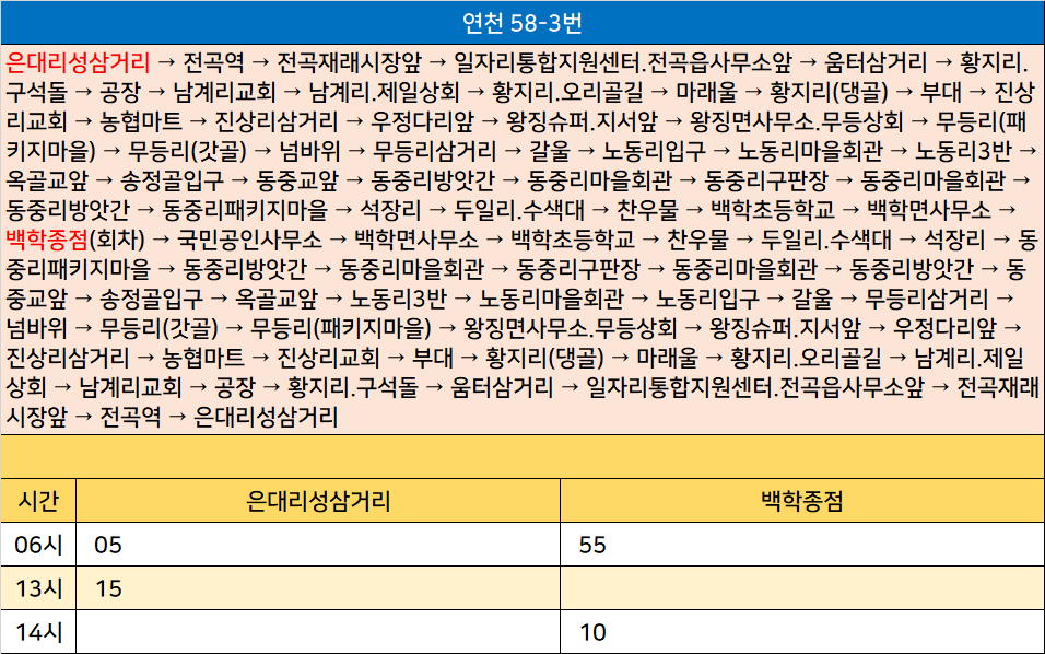 연천 58-3번: 은대리성삼거리 → 전곡역 → 전곡재래시장앞 → 일자리통합지원센터.전곡읍사무소앞 → 움터삼거리 → 황지리.구석돌 → 공장 → 남계리교회 → 남계리.제일상회 → 황지리.오리골길 → 마래울 → 황지리(댕골) → 부대 → 진상리교회 → 농협마트 → 진상리삼거리 → 우정다리앞 → 왕징슈퍼.지서앞 → 왕징면사무소.무등상회 → 무등리(패키지마을) → 무등리(갓골) → 넘바위 → 무등리삼거리 → 갈울 → 노동리입구 → 노동리마을회관 → 노동리3반 → 옥골교앞 → 송정골입구 → 동중교앞 → 동중리방앗간 → 동중리마을회관 → 동중리구판장 → 동중리마을회관 → 동중리방앗간 → 동중리패키지마을 → 석장리 → 두일리.수색대 → 찬우물 → 백학초등학교 → 백학면사무소 → 백학종점(회차) → 국민공인사무소 → 백학면사무소 → 백학초등학교 → 찬우물 → 두일리.수색대 → 석장리 → 동중리패키지마을 → 동중리방앗간 → 동중리마을회관 → 동중리구판장 → 동중리마을회관 → 동중리방앗간 → 동중교앞 → 송정골입구 → 옥골교앞 → 노동리3반 → 노동리마을회관 → 노동리입구 → 갈울 → 무등리삼거리 → 넘바위 → 무등리(갓골) → 무등리(패키지마을) → 왕징면사무소.무등상회 → 왕징슈퍼.지서앞 → 우정다리앞 → 진상리삼거리 → 농협마트 → 진상리교회 → 부대 → 황지리(댕골) → 마래울 → 황지리.오리골길 → 남계리.제일상회 → 남계리교회 → 공장 → 황지리.구석돌 → 움터삼거리 → 일자리통합지원센터.전곡읍사무소앞 → 전곡재래시장앞 → 전곡역 → 은대리성삼거리