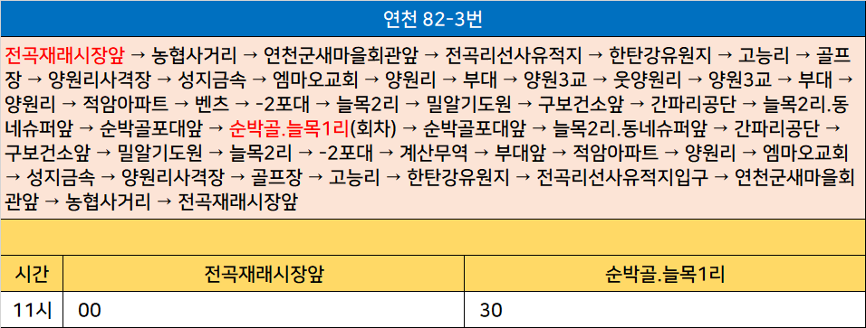연천 82-3번: 전곡재래시장앞 → 농협사거리 → 연천군새마을회관앞 → 전곡리선사유적지 → 한탄강유원지 → 고능리 → 골프장 → 양원리사격장 → 성지금속 → 엠마오교회 → 양원리 → 부대 → 양원3교 → 웃양원리 → 양원3교 → 부대 → 양원리 → 적암아파트 → 벤츠 → -2포대 → 늘목2리 → 밀알기도원 → 구보건소앞 → 간파리공단 → 늘목2리.동네슈퍼앞 → 순박골포대앞 → 순박골.늘목1리(회차) → 순박골포대앞 → 늘목2리.동네슈퍼앞 → 간파리공단 → 구보건소앞 → 밀알기도원 → 늘목2리 → -2포대 → 계산무역 → 부대앞 → 적암아파트 → 양원리 → 엠마오교회 → 성지금속 → 양원리사격장 → 골프장 → 고능리 → 한탄강유원지 → 전곡리선사유적지입구 → 연천군새마을회관앞 → 농협사거리 → 전곡재래시장앞