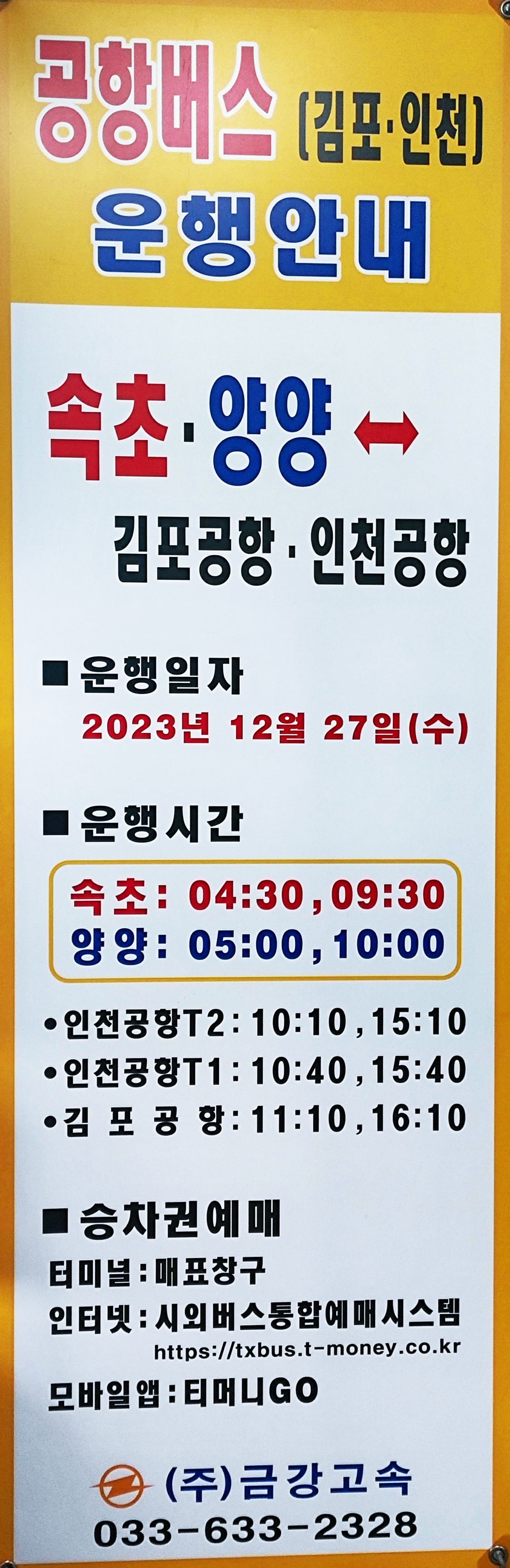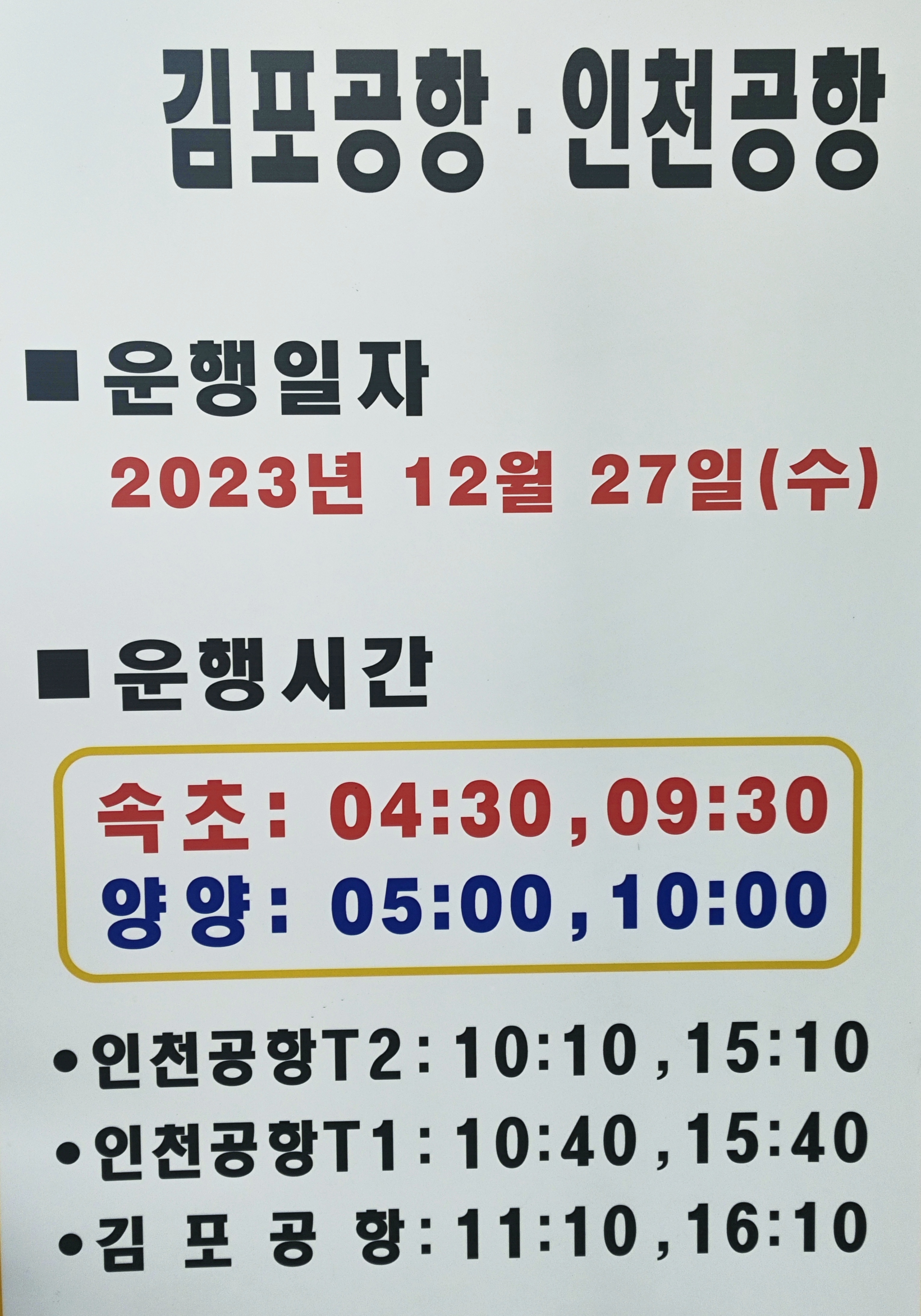 속초 ↔ 양양 ↔ 김포공항 ↔ 인천공항T1 ↔ 인천공항T2