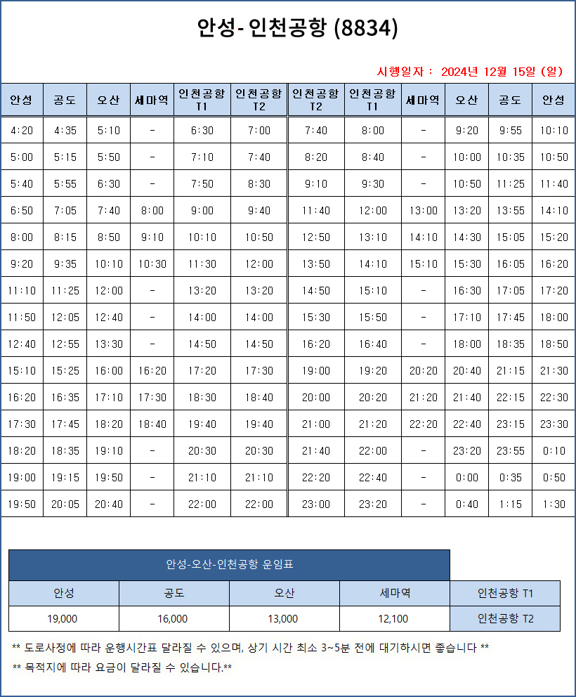▶ 안성 ↔ 인천공항 출발 시간표 ↓