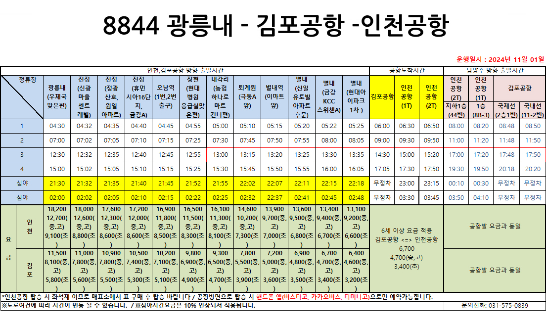 ▶ 공항버스 8844 N8844 출발 시간표 & 요금표 ↑