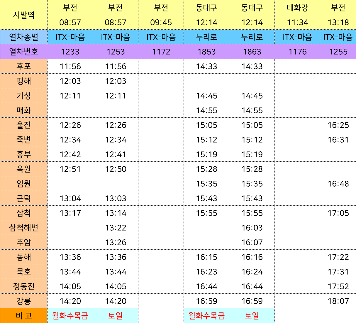 남행 기차 시간표