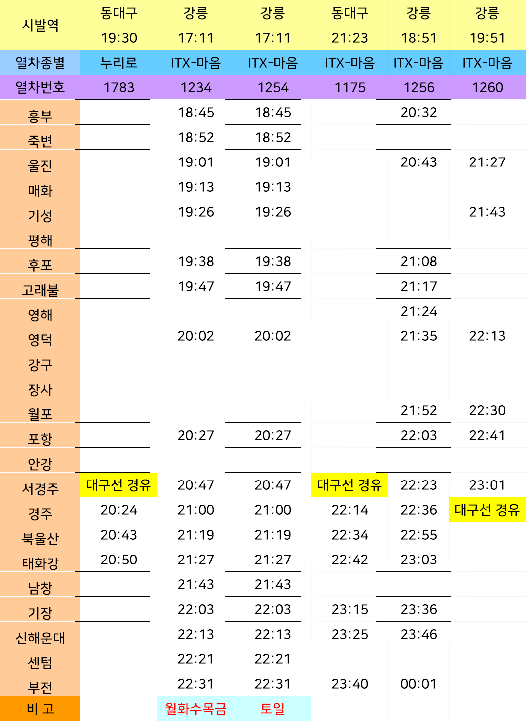 남행 기차 시간표